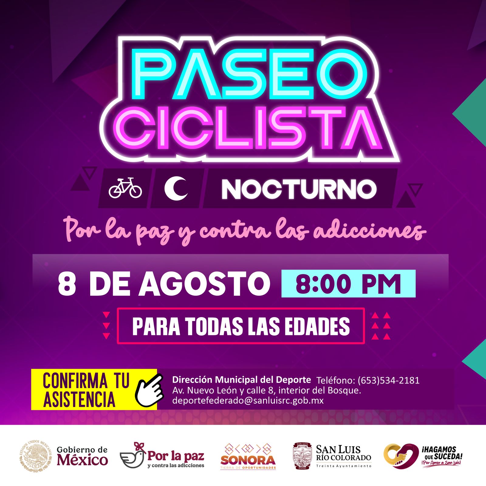 ðð Y a las 8:00 pm, la DirecciÃn del Deporte Municipal te invita al Paseo Ciclista Nocturno, una experiencia Ãnica para compartir en comunidad y fomentar la sana convivencia como parte de la Jornada Nacional por la Paz y contra las Adicciones.