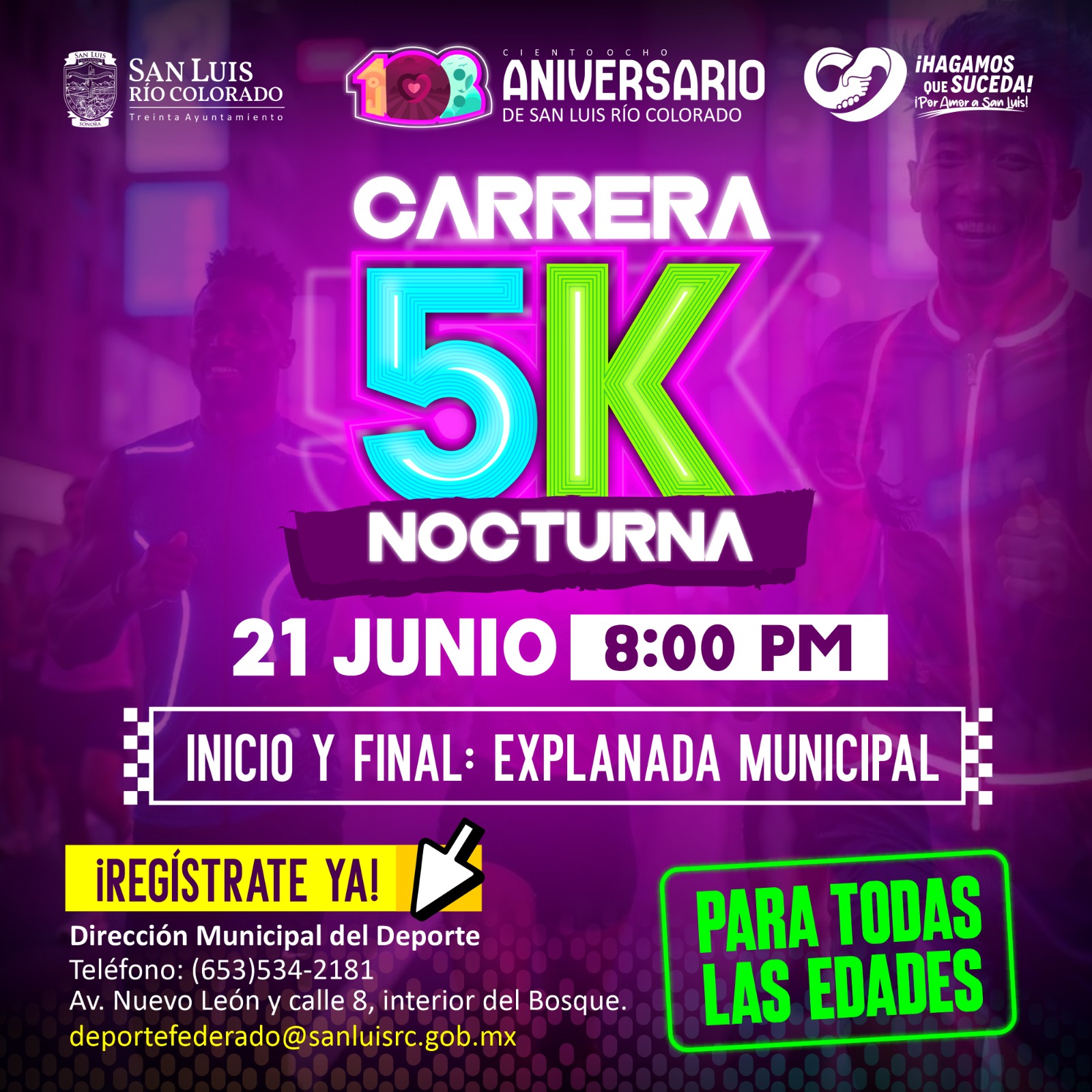 San Luis RÃo Colorado (Junio 14 de 2025).- Como parte de las celebraciones por el 108 Aniversario de la fundaciÃn de San Luis RÃo Colorado, el 30 Ayuntamiento, a travÃs de la DirecciÃn del Deporte Municipal, anuncià la apertura de inscripciones para la Carrera Nocturna 5K, dirigida a personas de todas las edades.