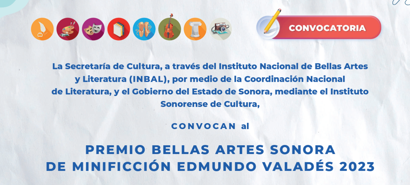 La SecretarÃa de Cultura del Gobierno de MÃxico y el Instituto Nacional de Bellas Artes y Literatura (Inbal), mediante la CoordinaciÃn Nacional de Literatura (CNL), y el gobierno de Sonora, a travÃs del Instituto Sonorense de Cultura, convocan al Premio Bellas Artes Sonora de MinificciÃn Edmundo ValadÃs 2023.