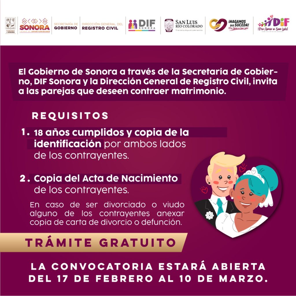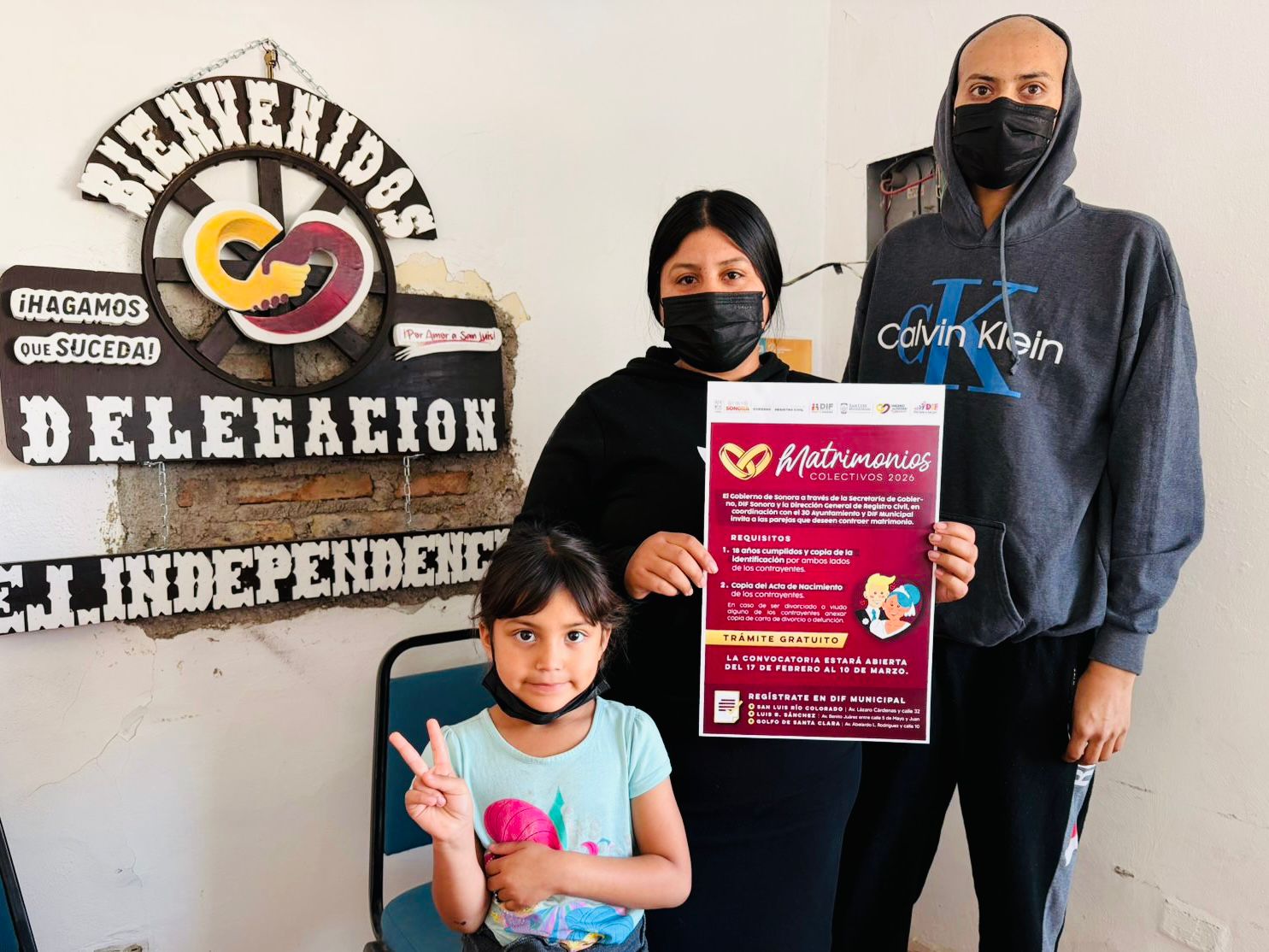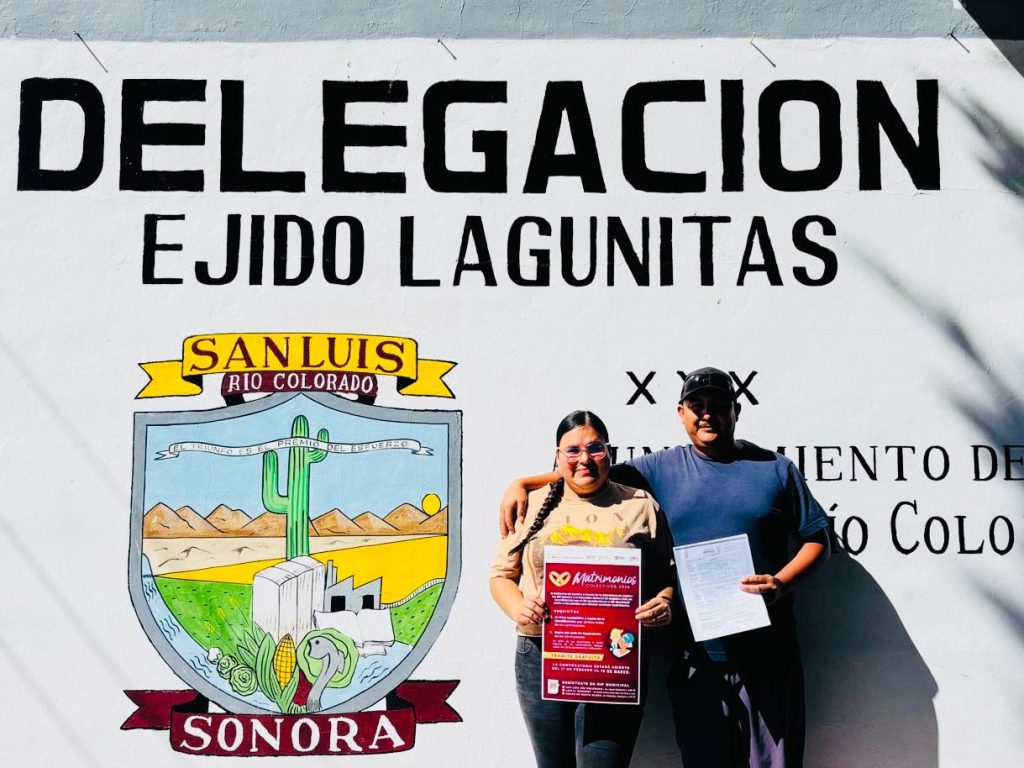San Luis RÃo Colorado, Sonora (Marzo 04 de 2026).- Con el objetivo de acercar certeza jurÃdica a las parejas y facilitar el acceso al matrimonio civil en las comunidades rurales, el 30 Ayuntamiento, a travÃs del Sistema DIF Municipal, en coordinaciÃn con el Gobierno del Estado de Sonora y la DirecciÃn General del Registro Civil, llevà la campaÃa de Matrimonios Colectivos a los ejidos Lagunitas e Independencia, permitiendo que mÃs familias del valle iniciaran su trÃmite.