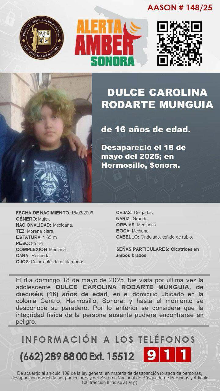 La FiscalÃa General de Justicia del Estado de Sonora (FGJE) emitià una Alerta AMBER para la bÃsqueda y localizaciÃn de Dulce Carolina Rodarte MunguÃa, de 16 aÃos de edad, quien fue vista por Ãltima vez el pasado 18 de mayo de 2025 en Hermosillo, Sonora.