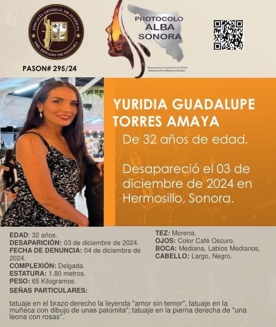 Hermosillo, Sonora â Las autoridades han activado el Protocolo Alba en Hermosillo para localizar a Yuridia Guadalupe Torres Amaya, quien fue reportada como desaparecida desde el martes 3 de diciembre.