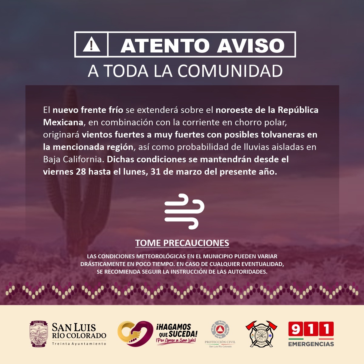 San Luis RÃo Colorado, Sonora (Marzo 28 de 2025).- Ante la reciente actualizaciÃn del pronÃstico del clima, la DirecciÃn de ProtecciÃn Civil y Bomberos Municipales advierte a la comunidad de la presencia de fuertes vientos en la regiÃn con posibles rÃfagas de 30 a 50 km/h para este fin de semana.