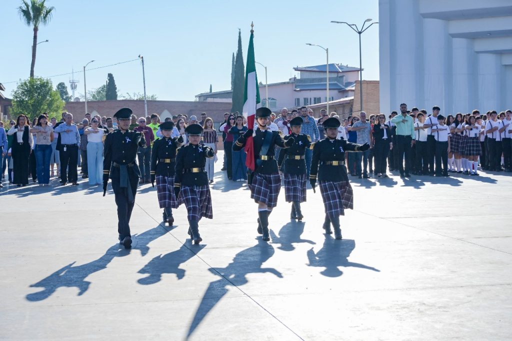 Agua Prieta, Sonora; a 23 de septiembre de 2025.- El alcalde de Agua Prieta, Josà Manuel Quijada Lamadrid, encabezà el primer Lunes CÃvico ante la monumental asta bandera de la Plaza Plan de Agua Prieta, acompaÃado de estudiantes del CBTis 81, funcionarios municipales y autoridades educativas.