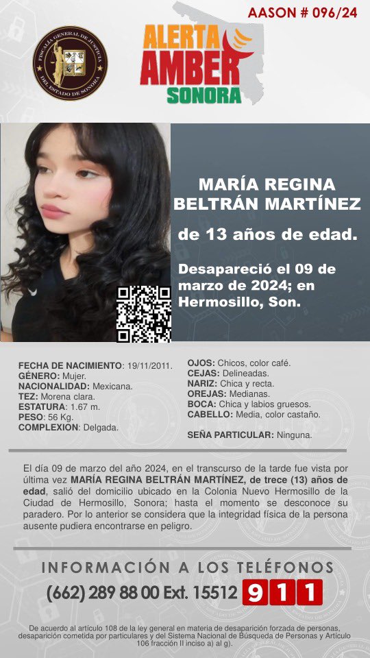 Hermosillo, Sonora.- LaÂFiscalÃa General de Justicia Del Estado de SonoraÂ(FGJE), activà la Alerta Amber para localizar a MarÃa Regina BeltrÃn RodrÃguez de 13 aÃos de edad, quienÂdesaparecià el 09 de marzo del 2024.Â