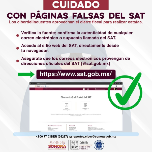 Para evitar que contribuyentes y el pÃblico en general sean vÃctimas de estafas y fraudes a travÃs de pÃginas web y correos electrÃnicos que suplantan la identidad del Sistema de AdministraciÃn Tributaria (SAT), la Unidad CibernÃtica de la SecretarÃa de Seguridad PÃblica (SSP) de Sonora recomendà extremar las medidas de prevenciÃn.