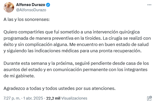 El gobernador de Sonora, Alfonso Durazo MontaÃo, informà a travÃs de sus redes sociales que fue sometido a una intervenciÃn quirÃrgica programada en la tiroides. La cirugÃa fue exitosa y no presentà complicaciones. Durazo aclarà que se tratà de una operaciÃn preventiva y que se encuentra en buen estado de salud.