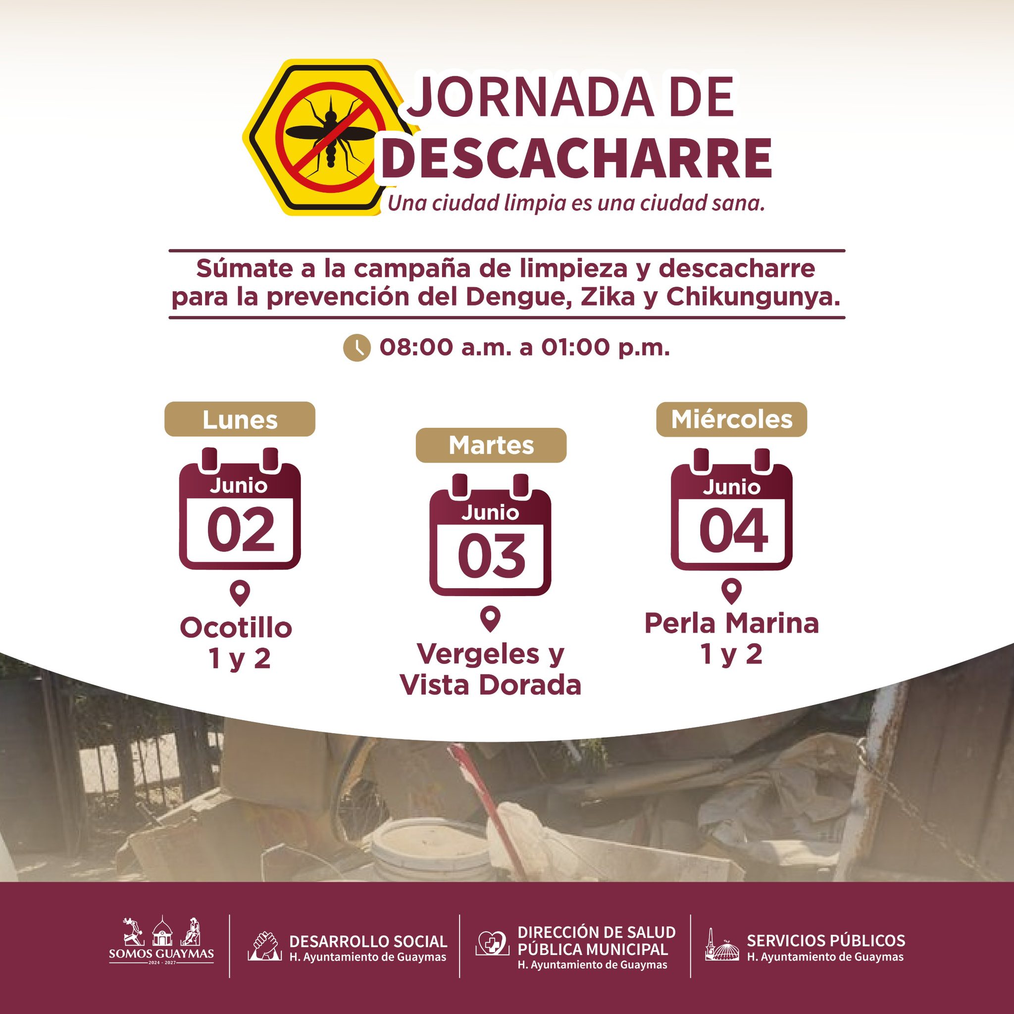 Del 2 al 4 de junio, el Ayuntamiento de Guaymas llevarà a cabo una jornada de descacharre en las colonias Ocotillo 1 y 2, Vergeles, Vista Dorada, Perla Marina 1 y 2, como parte de su estrategia para combatir enfermedades como dengue, zika y chikungunya.