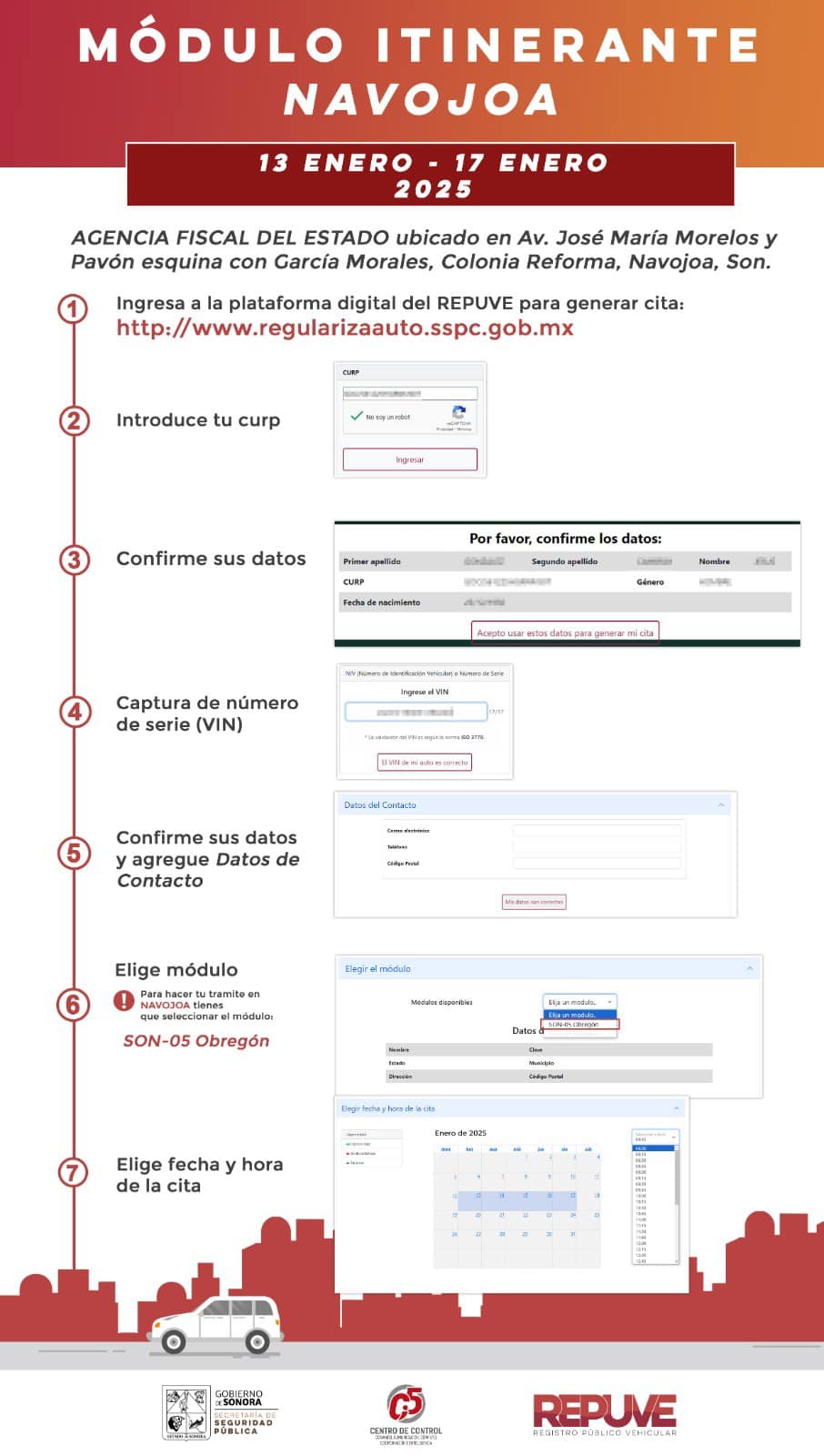 El MÃdulo Itinerante de REPUVE estarà disponible en Navojoa del 13 al 17 de enero. Si necesitas regularizar tu vehÃculo, solo sigue estos sencillos pasos para generar tu cita en la Agencia Fiscal local y realizar el trÃmite de forma rÃpida y cÃmoda.