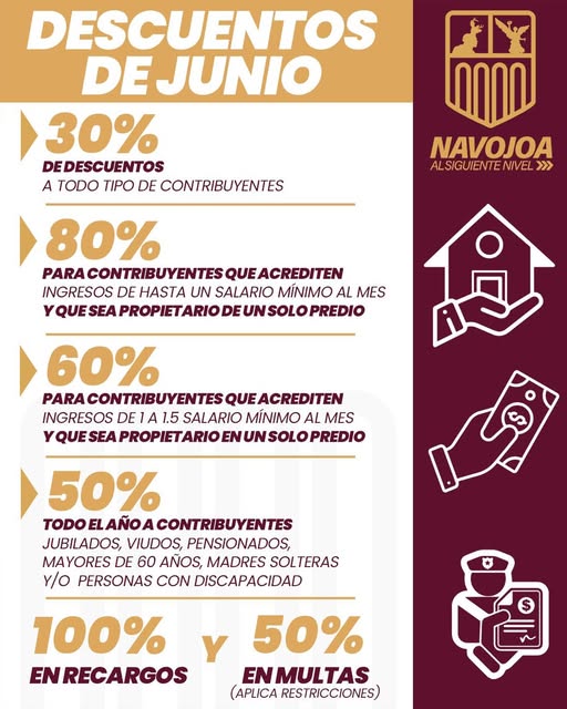 Durante todo el mes de junio, el Municipio de Navojoa extiende los grandes descuentos en los pagos del predial. Esta es una excelente oportunidad para ponerte al corriente y evitar recargos.