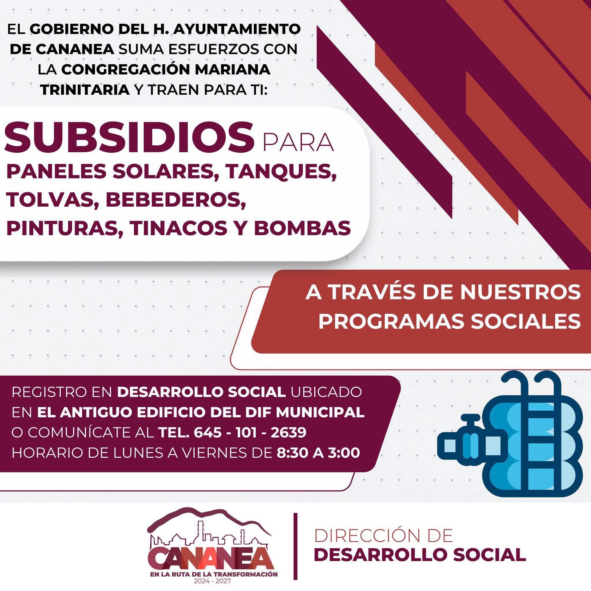 El Gobierno Municipal de Cananea, a travÃs de la DirecciÃn de Desarrollo Social, invita a la comunidad a aprovechar los subsidios disponibles en colaboraciÃn con la CongregaciÃn Mariana Trinitaria, para mejorar la calidad de vida en el municipio.