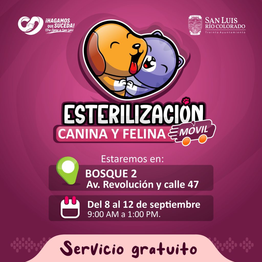 San Luis RÃo Colorado, Sonora (Septiembre 06 de 2025).- Con el propÃsito de velar por el bienestar animal y prevenir la sobrepoblaciÃn de animales de compaÃÃa en la ciudad, este lunes 08 de septiembre el 30 Ayuntamiento, a travÃs de la DirecciÃn de Salud PÃblica Municipal, pondrà en marcha la nueva jornada de EsterilizaciÃn MÃvil de perros y gatos en el Bosque #2 (Av. RevoluciÃn y 47).