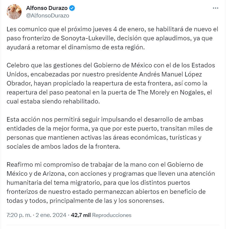 El gobernador del estado de Sonora, Alfonso Durazo, anuncià la reapertura de la garita de Lukeville-Sonoyta el jueves 4 de enero, esto a travÃs de su cuenta de X (Twitter).
