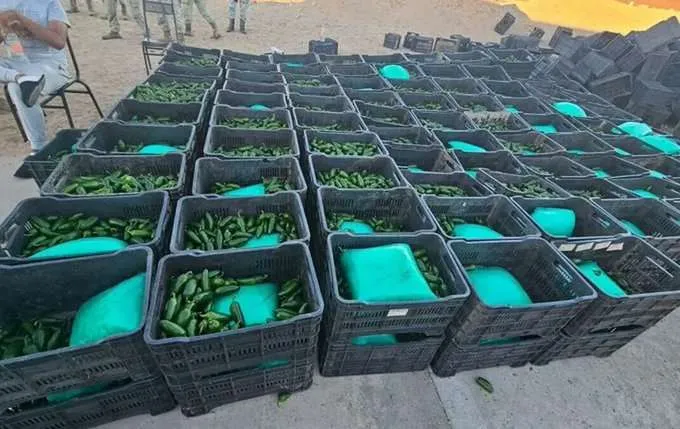 San Luis RÃo Colorado, Sonora; 27 de octubre de 2025.â Elementos del EjÃrcito Mexicano y la Guardia Nacional localizaron 1 175 kilogramos de estupefacientes âmetanfetamina, fentanilo y goma de opioâ entre cajas de chile jalapeÃo y serrano que transportaba un trÃiler de la empresa âTransportes Refrigerados del Norteâ, durante una revisiÃn en el Puesto Militar de Seguridad âCucapahâ.