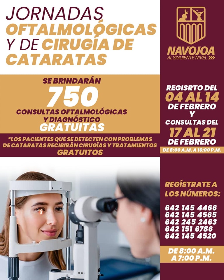 El Gobierno Municipal de Navojoa, a travÃs de la DirecciÃn de Salud, ofrece una jornada oftalmolÃgica gratuita para los residentes que necesiten atenciÃn ocular. Se brindarÃn 750 consultas oftalmolÃgicas con estudios de fondo de ojo y diagnÃstico para detectar cataratas.
