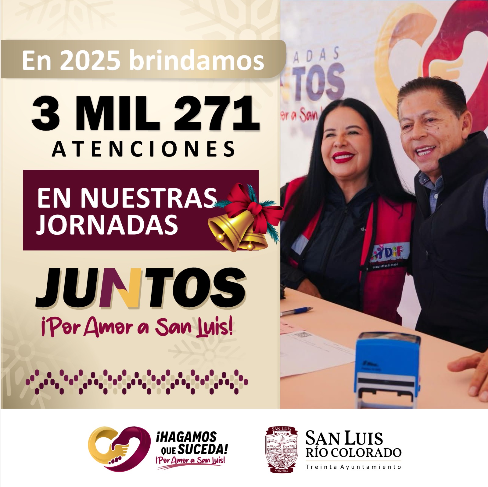 San Luis RÃo Colorado, Sonora (Diciembre 31 de 2025).- De manera cercana y directa, durante este 2025 el 30 Ayuntamiento atendià a 3 mil 271 sanluisinas y sanluisinos por medio de las jornadas comunitarias âJuntos Por Amor a San Luisâ, brindando apoyo, orientaciÃn y diversos servicios a quienes mÃs lo necesitan.