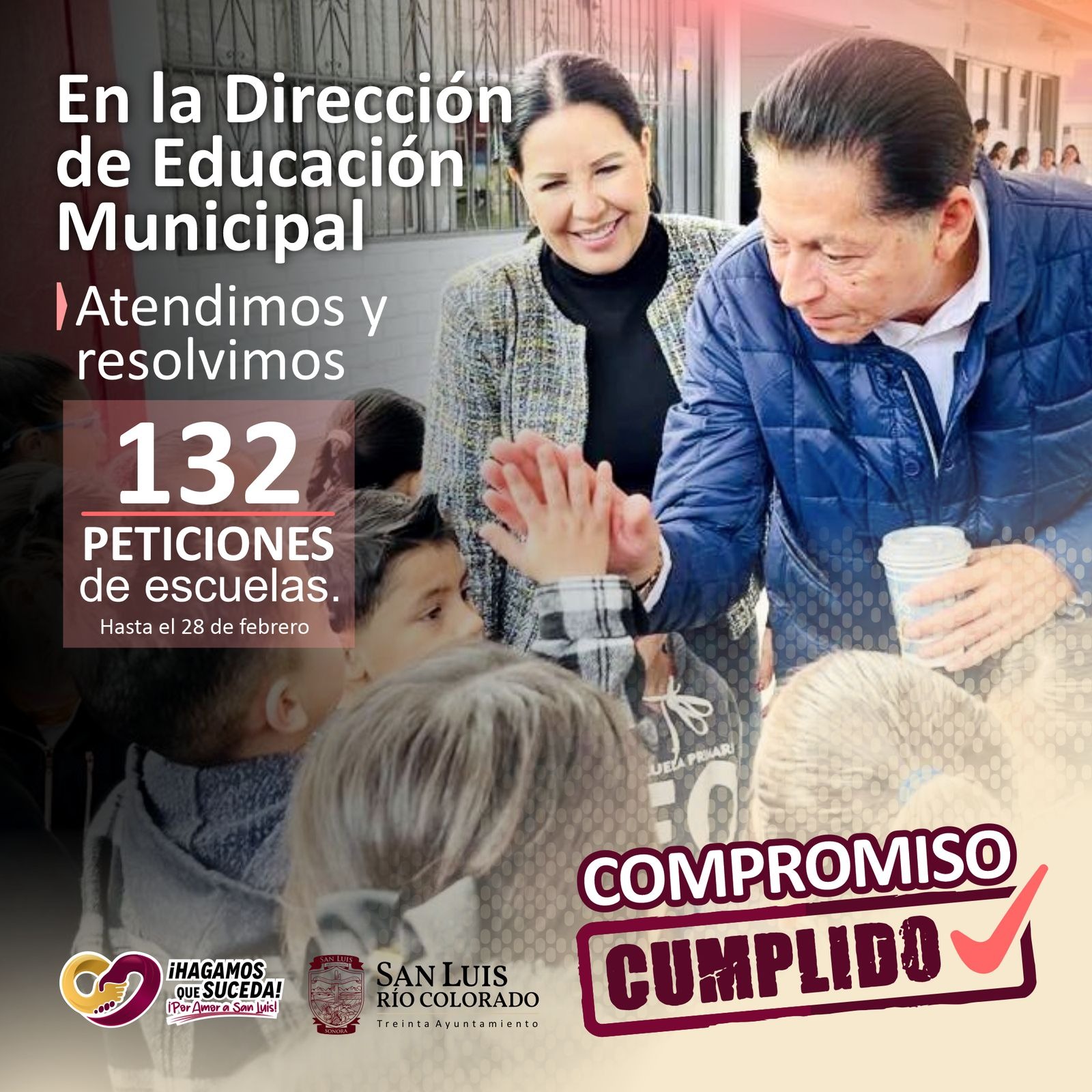 Hasta el 28 de febrero de 2025, la DirecciÃn de EducaciÃn Municipal ha atendido un total de 132 peticiones, destacÃ, abordando necesidades de infraestructura y servicios en escuelas locales de los distintos niveles educativos.