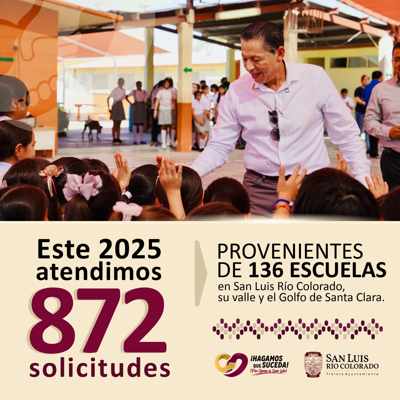 San Luis RÃo Colorado, Sonora (Diciembre 10 de 2025).- En lo que va del aÃo, el 30 Ayuntamiento, a travÃs de la DirecciÃn de EducaciÃn Municipal, ha atendido un total de 872 solicitudes provenientes de 136 escuelas de la ciudad, el valle y el Golfo de Santa Clara.