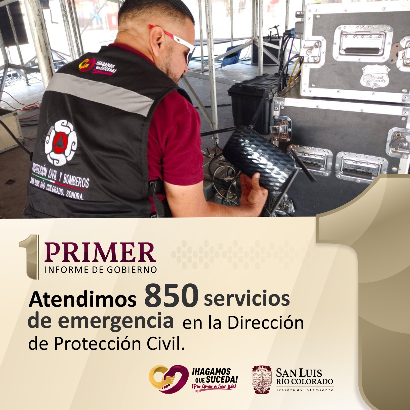 San Luis RÃo Colorado, Sonora (Septiembre 12 de 2025).- Siempre en primera lÃnea, en este primer aÃo de trabajo el 30 Ayuntamiento, a travÃs de la DirecciÃn de ProtecciÃn Civil y Bomberos Municipales, atendià un total de 850 servicios de emergencia, gracias al compromiso y vocaciÃn de servicio de su personal.