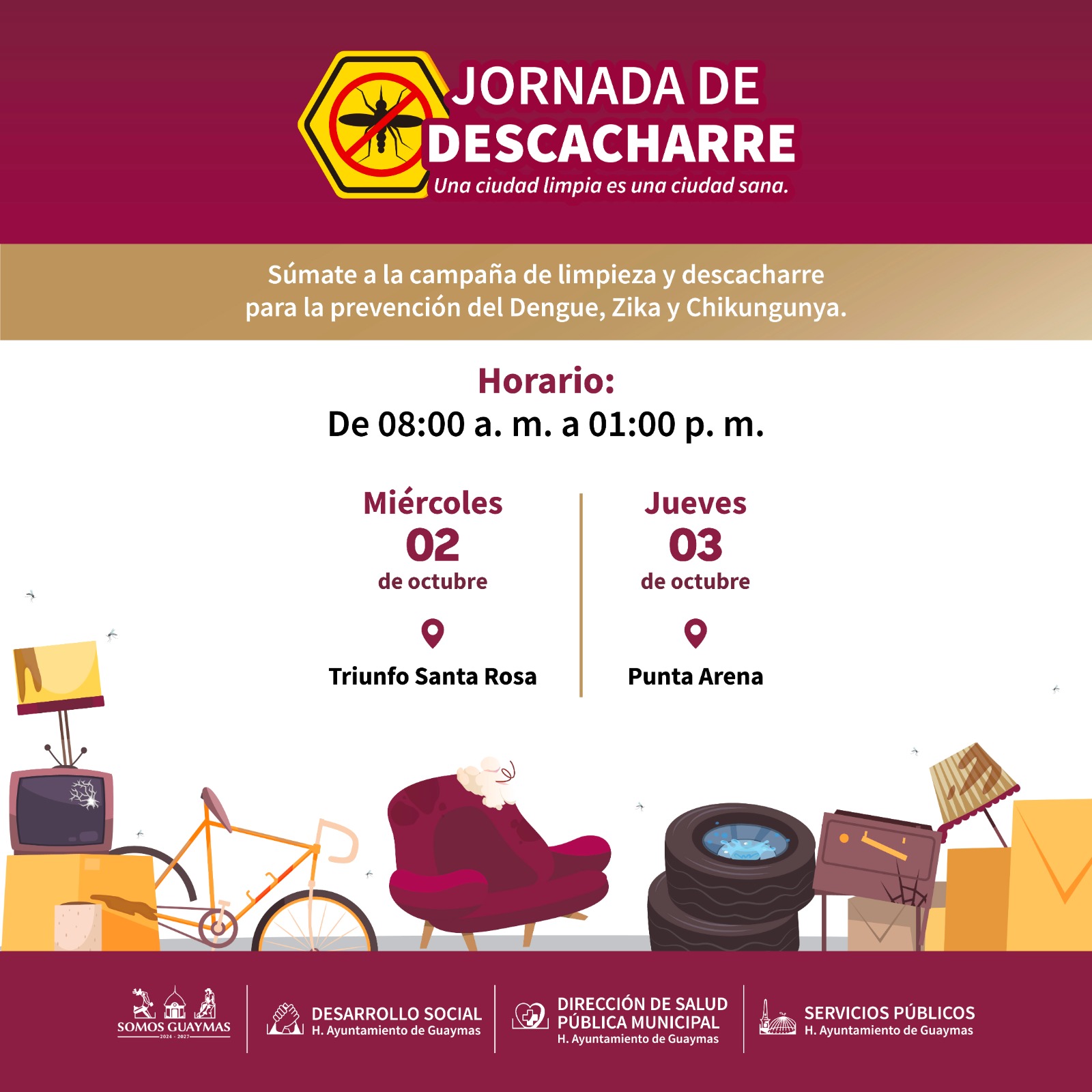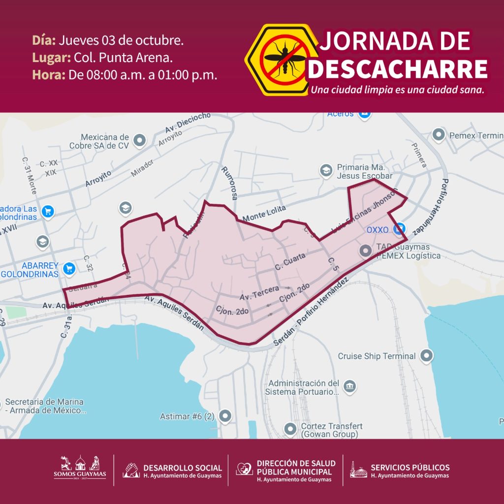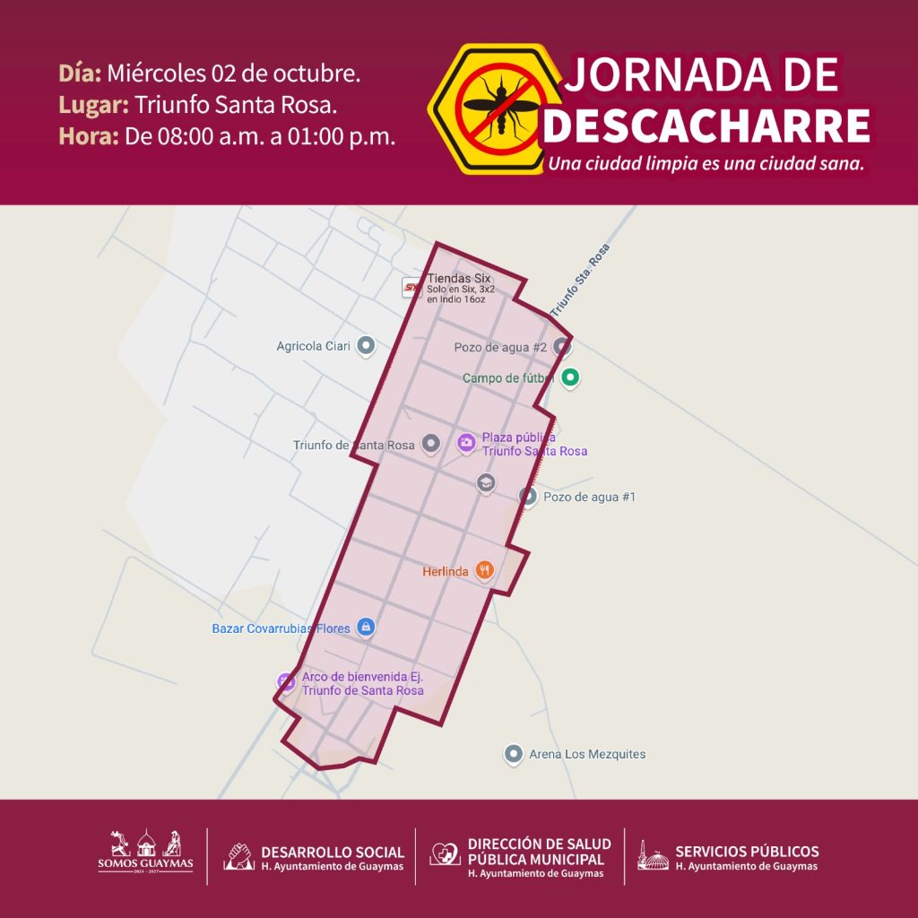 El Ayuntamiento de Guaymas convoca a las familias del ejido Triunfo Santa Rosa y la colonia Punta Arena a participar en una jornada de descacharre y limpieza de patios, programada para el 2 y 3 de octubre. La directora de Salud PÃblica Municipal, Austria Castro Gracia, hizo el anuncio, enfatizando la importancia de esta actividad en la prevenciÃn de enfermedades como zika, dengue y chikungunya.