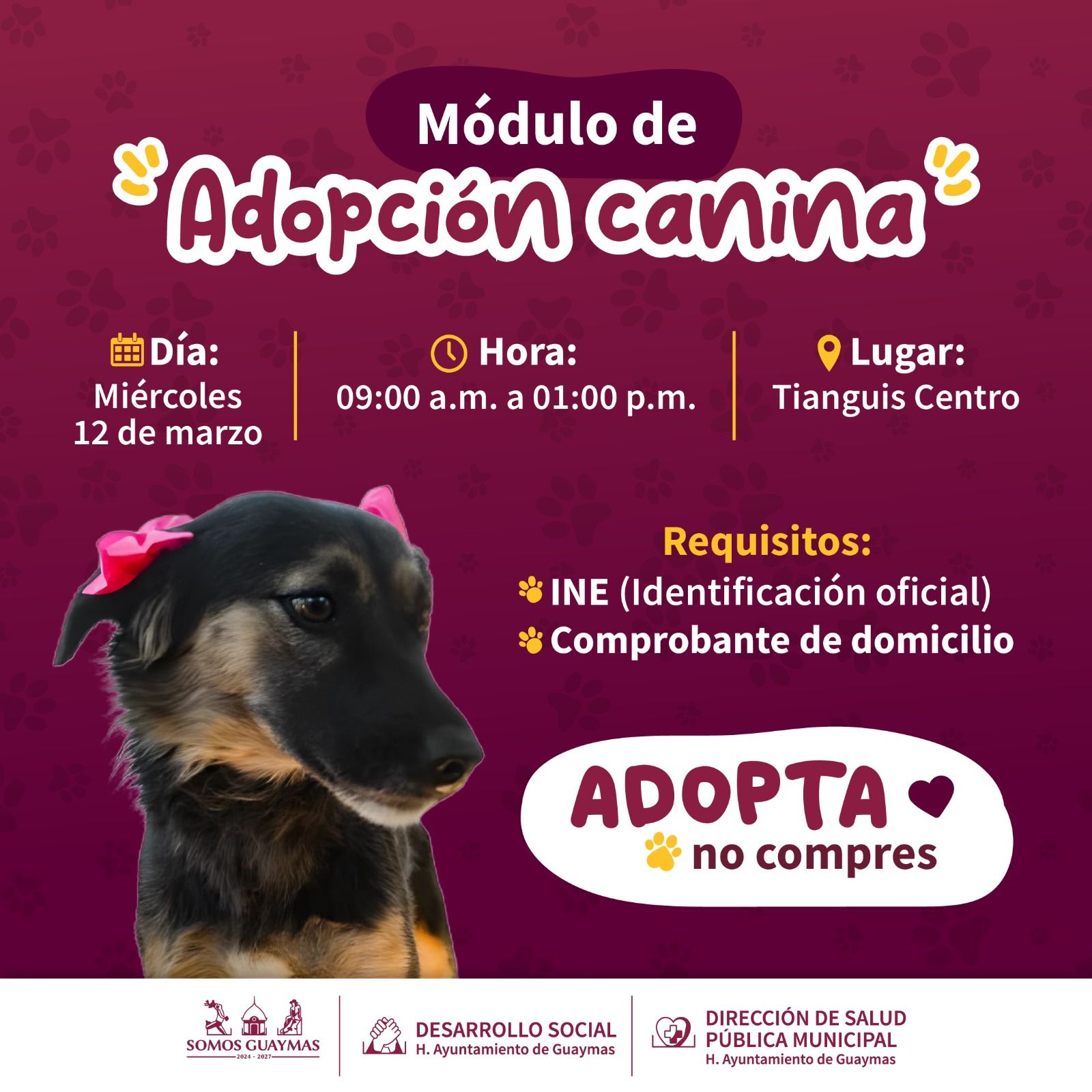 El Ayuntamiento de Guaymas, a travÃs de las Ãreas de Desarrollo Social y Salud PÃblica Municipal, invita a la comunidad a visitar el mÃdulo de adopciÃn canina este miÃrcoles 12 de marzo en el Tianguis Centro.