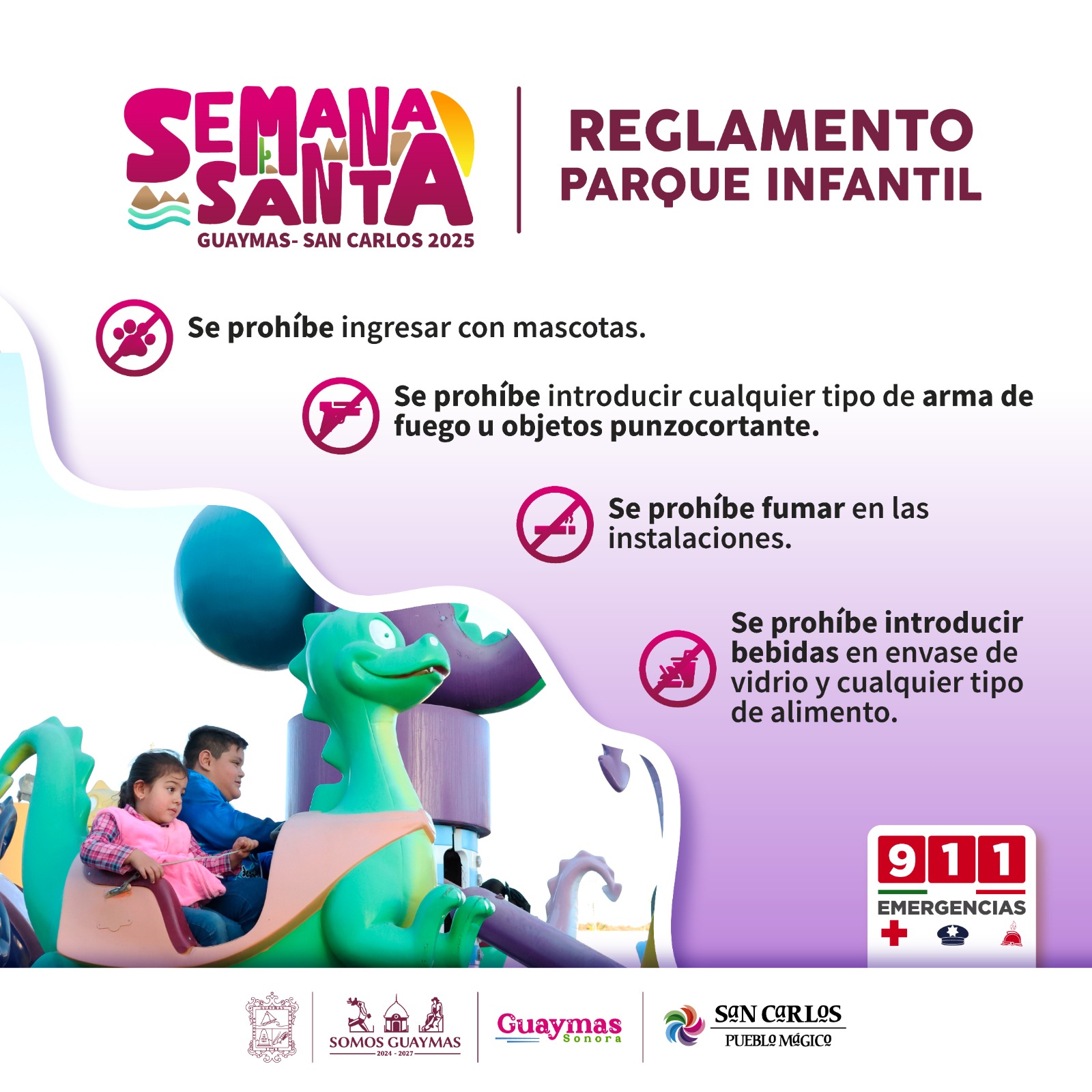 Guaymas, Sonora.â El H. Ayuntamiento de Guaymas hizo un llamado a la comunidad a seguir el reglamento de seguridad en el Parque Infantil para garantizar un ambiente seguro para todos los visitantes. A travÃs de una imagen compartida en sus redes sociales, el gobierno local recordà las normas que deben cumplirse para disfrutar de las atracciones sin riesgos.