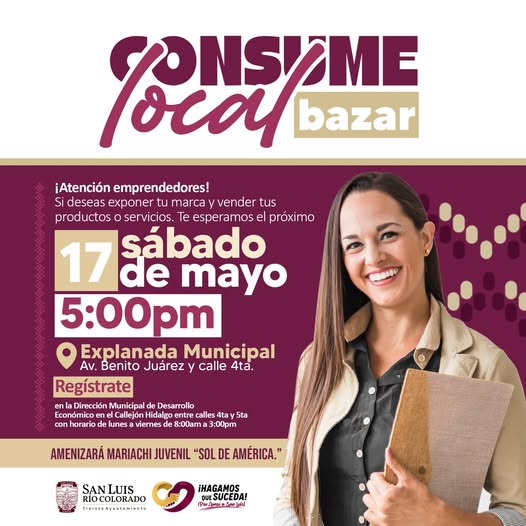 El 30 Ayuntamiento de San Luis RÃo Colorado, a travÃs de la DirecciÃn de Desarrollo EconÃmico, invita a toda la comunidad a asistir al Bazar Emprendedor, un evento diseÃado para promover y apoyar a los emprendedores locales.