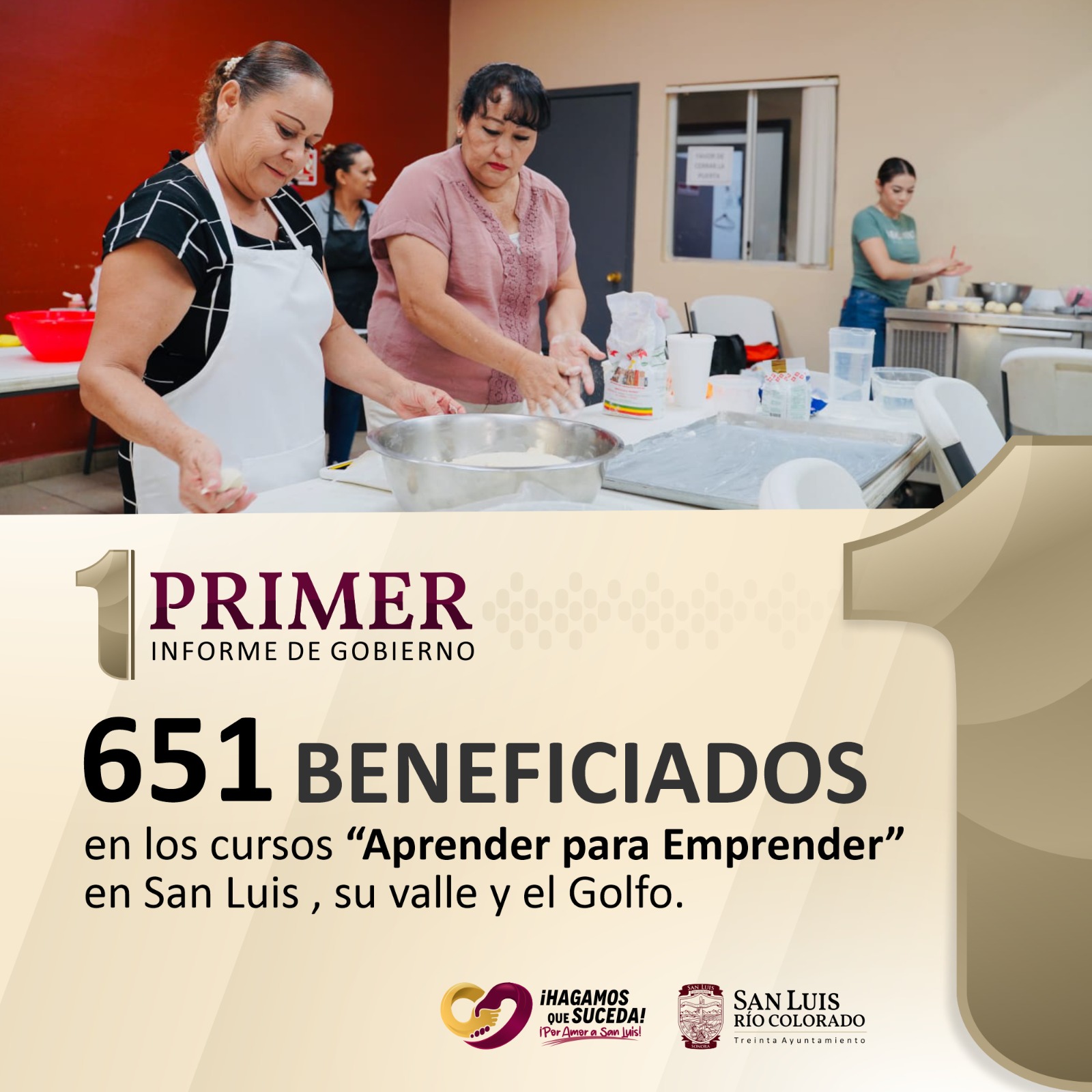 San Luis RÃo Colorado, Sonora (09 de septiembre de 2024).- Durante su primer aÃo, el 30 Ayuntamiento de San Luis RÃo Colorado, a travÃs de la DirecciÃn de Desarrollo Social Municipal, beneficià a 651 sanluisinos con los cursos gratuitos âAprender para Emprenderâ.