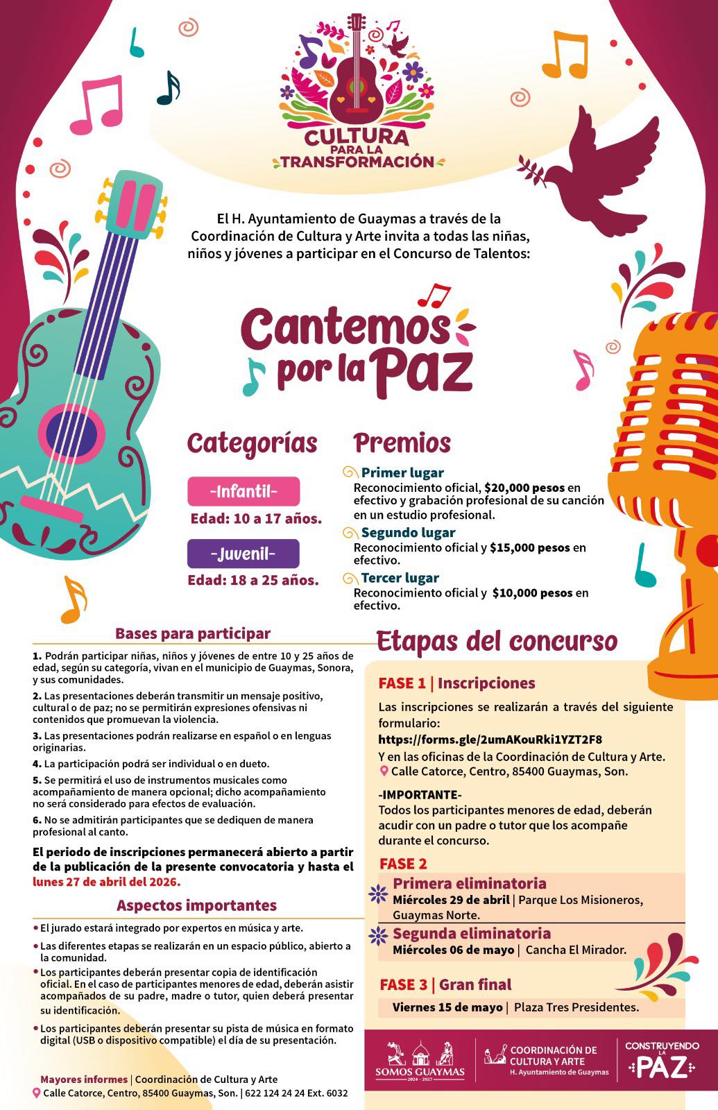 Guaymas, Sonora; a 25 de abril de 2026. Con el objetivo de fomentar la expresión artística y promover mensajes de armonía en la comunidad, el Ayuntamiento de Guaymas, a través de la Coordinación de Cultura y Arte, presentó el concurso de talentos “Cantemos por la Paz”.