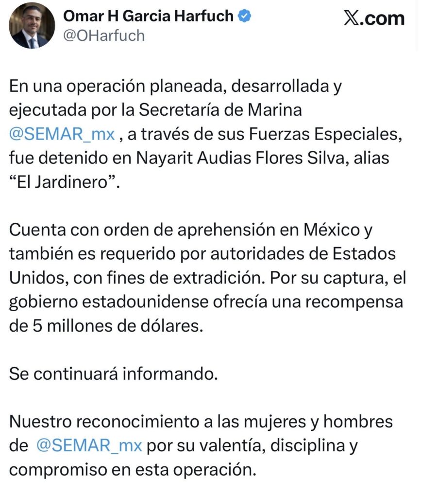 Ciudad de México; a 28 de abril de 2026. En una operación de alta precisión, elementos de las Fuerzas Especiales de la Secretaría de Marina (SEMAR) lograron la detención en Nayarit de Audias Flores Silva, alias “El Jardinero”, uno de los principales líderes operativos del Cártel Jalisco Nueva Generación (CJNG).