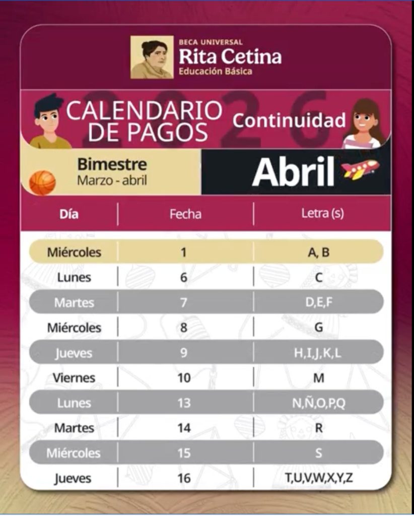 Beca «Rita Cetina»: Continuidad y regularidad Tà debes saber que, para las familias beneficiarias de continuidad en la Beca Universal de EducaciÃn BÃsica âRita Cetinaâ, el depÃsito correspondiente al bimestre marzo-abril se estarà realizando del 1 al 16 de abril. Es fundamental que los beneficiarios consulten su saldo de manera digital para evitar aglomeraciones innecesarias en los cajeros.
