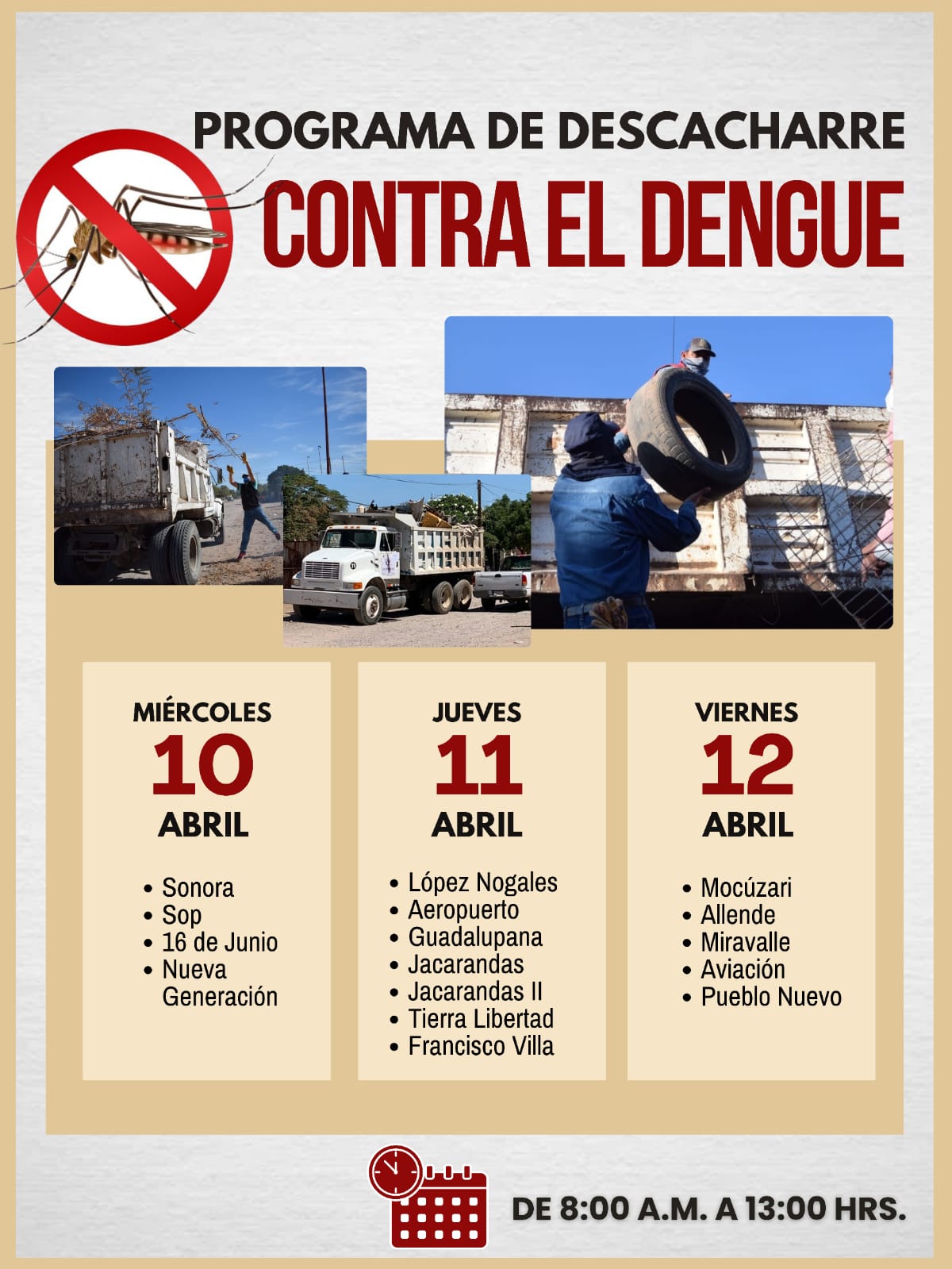 ððAtenciÃn, vecinos de estas colonias. SÃmate a la campaÃa de descacharre, este 10, 11 y 12 de abril, para evitar la proliferaciÃn del mosco transmisor del dengue. La participaciÃn de todos es importante para erradicar esta problemÃtica.