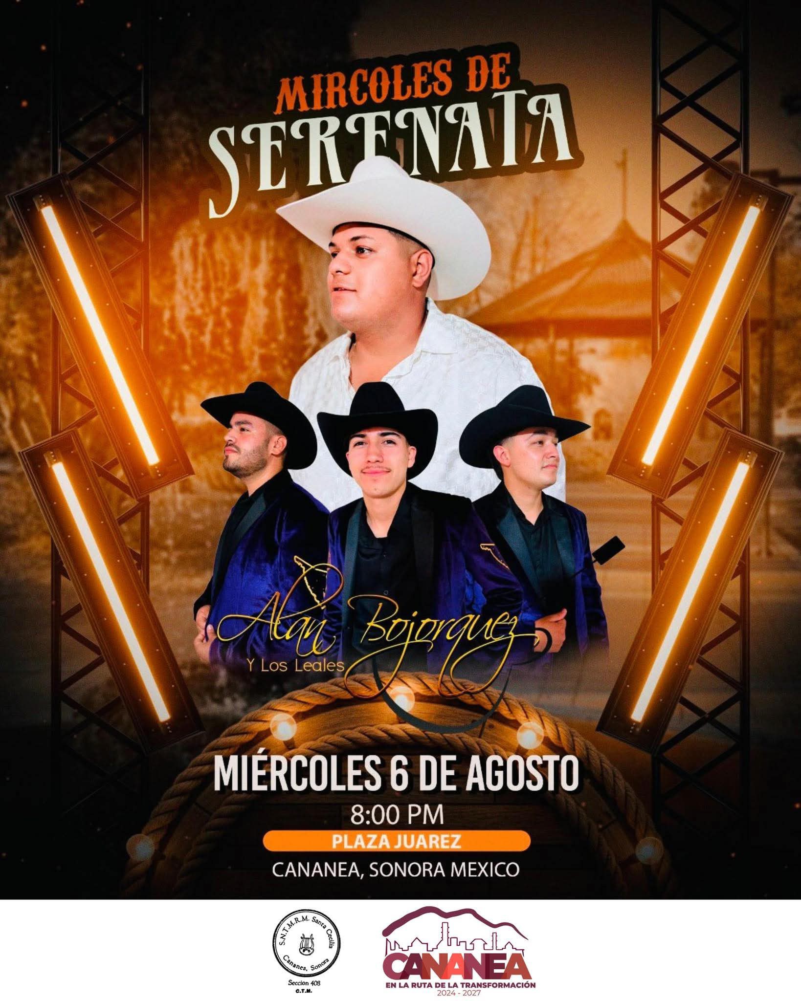 Cananea, Sonora; agosto de 2025.- Este miÃrcoles 6 de agosto, el Parque JuÃrez serà el escenario de una noche llena de mÃsica, tradiciÃn y alegrÃa familiar con la presentaciÃn especial de Alan BojÃrquez y Los Leales, como parte de la Tradicional Serenata de Verano.