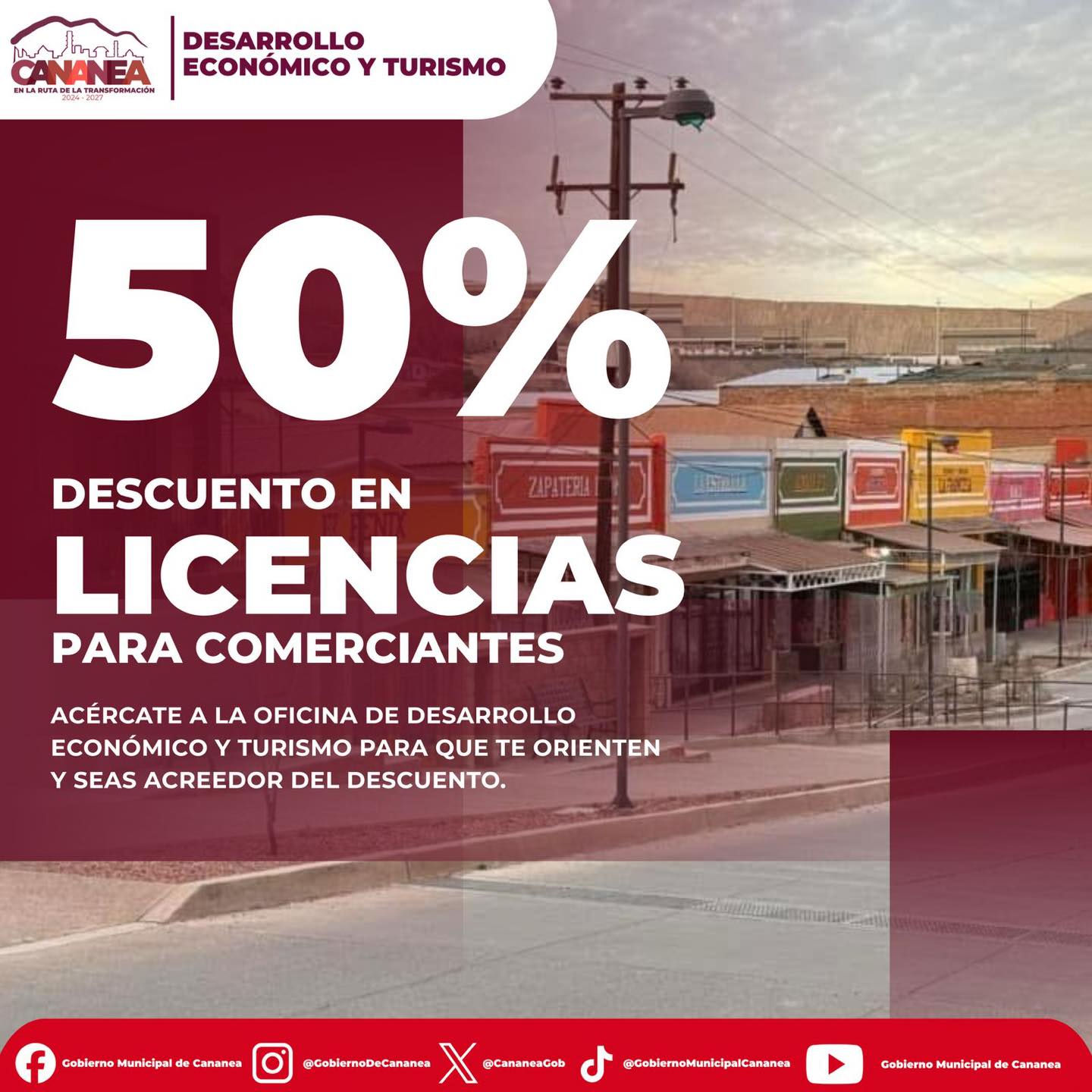 Con el objetivo de impulsar la regularizaciÃn de negocios y fortalecer la economÃa local, el Gobierno Municipal de Cananea anuncià un descuento del 50 por ciento en el trÃmite de licencias para comerciantes, vigente durante los meses de enero, febrero y marzo.