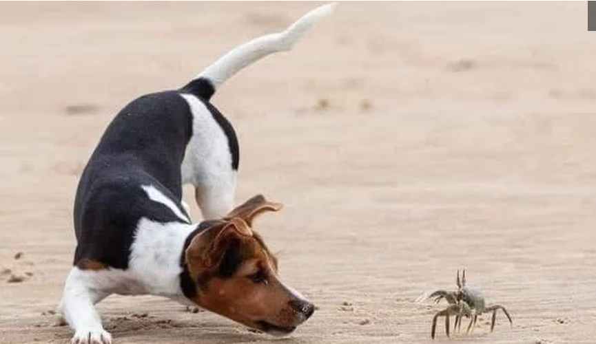 Las fotos muestran al perrito moviÃndose alrededor del cangrejo, ladrando juguetonamente y dando saltos atrÃs cada vez que el cangrejo intenta pinzarlo. Los espectadores han quedado encantados con la escena.