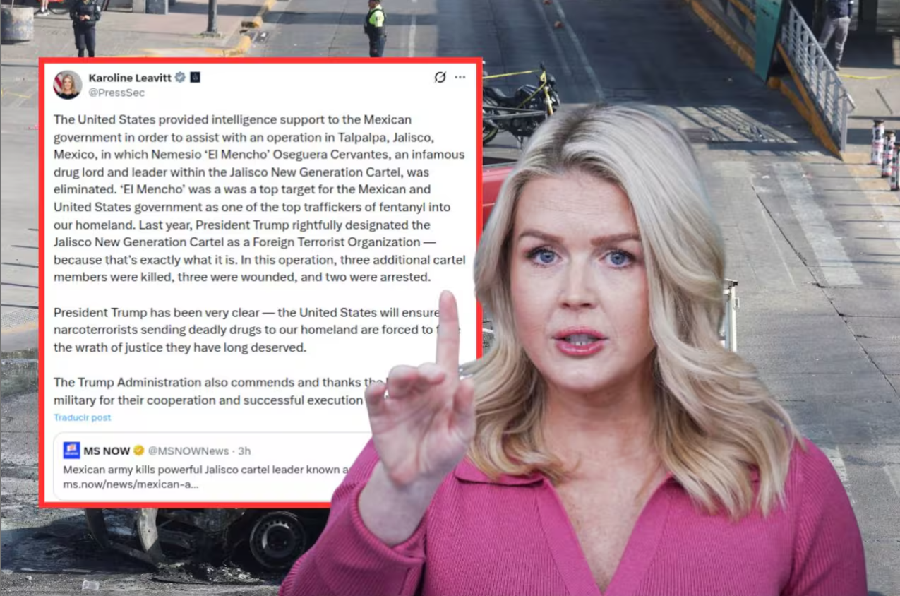 CooperaciÃn y Justicia: Leavitt elogià la ejecuciÃn del EjÃrcito Mexicano y subrayà que este golpe es una respuesta directa al trÃfico de fentanilo. «El presidente Trump designà correctamente al CJNG como OrganizaciÃn Terrorista â porque eso es exactamente lo que es», sentencià la vocera, asegurando que los responsables de enviar drogas mortales a EE. UU. enfrentarÃn ahora «el peso de la justicia».