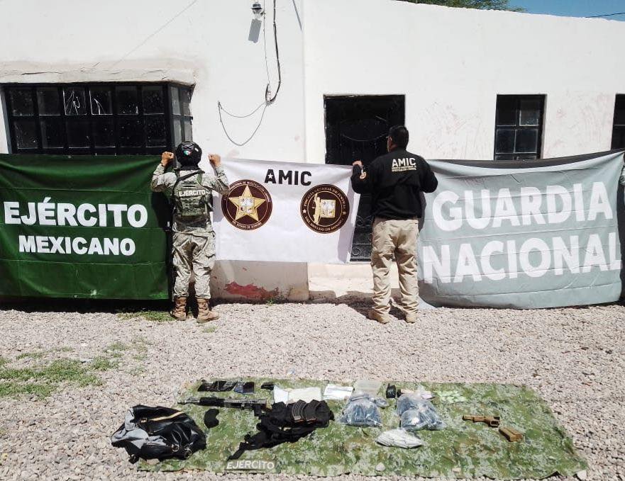 En el interior, se encontraron un fusil AK-47, una pistola calibre .9 mm, cargadores, droga tipo cristal, marihuana, cinco celulares, un radio portÃtil y equipo tÃctico, todos entregados al Ministerio PÃblico.