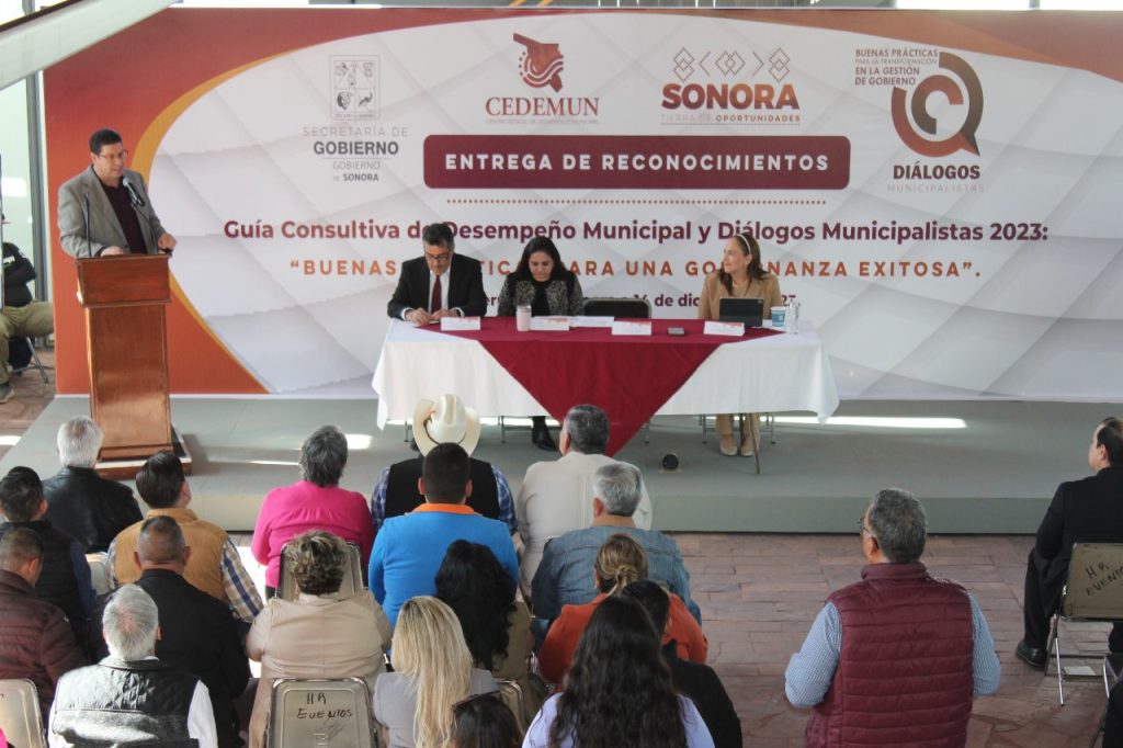Hermosillo, Sonora; a 14 de diciembre del 2023.- En una ceremonia llevada a cabo hoy en la Cineteca Sonora, el Centro Estatal de Desarrollo Municipal (CEDEMUN) destacà los notables logros de las administraciones municipales a lo largo del estado. Bajo el lema «Buenas PrÃcticas para una Gobernanza Exitosa», la entrega de Reconocimientos de la GuÃa Consultiva de DesempeÃo Municipal y DiÃlogos Municipalistas 2023 resaltà la dedicaciÃn y el excepcional progreso de los municipios en la implementaciÃn de las mejores prÃcticas de gestiÃn pÃblica.