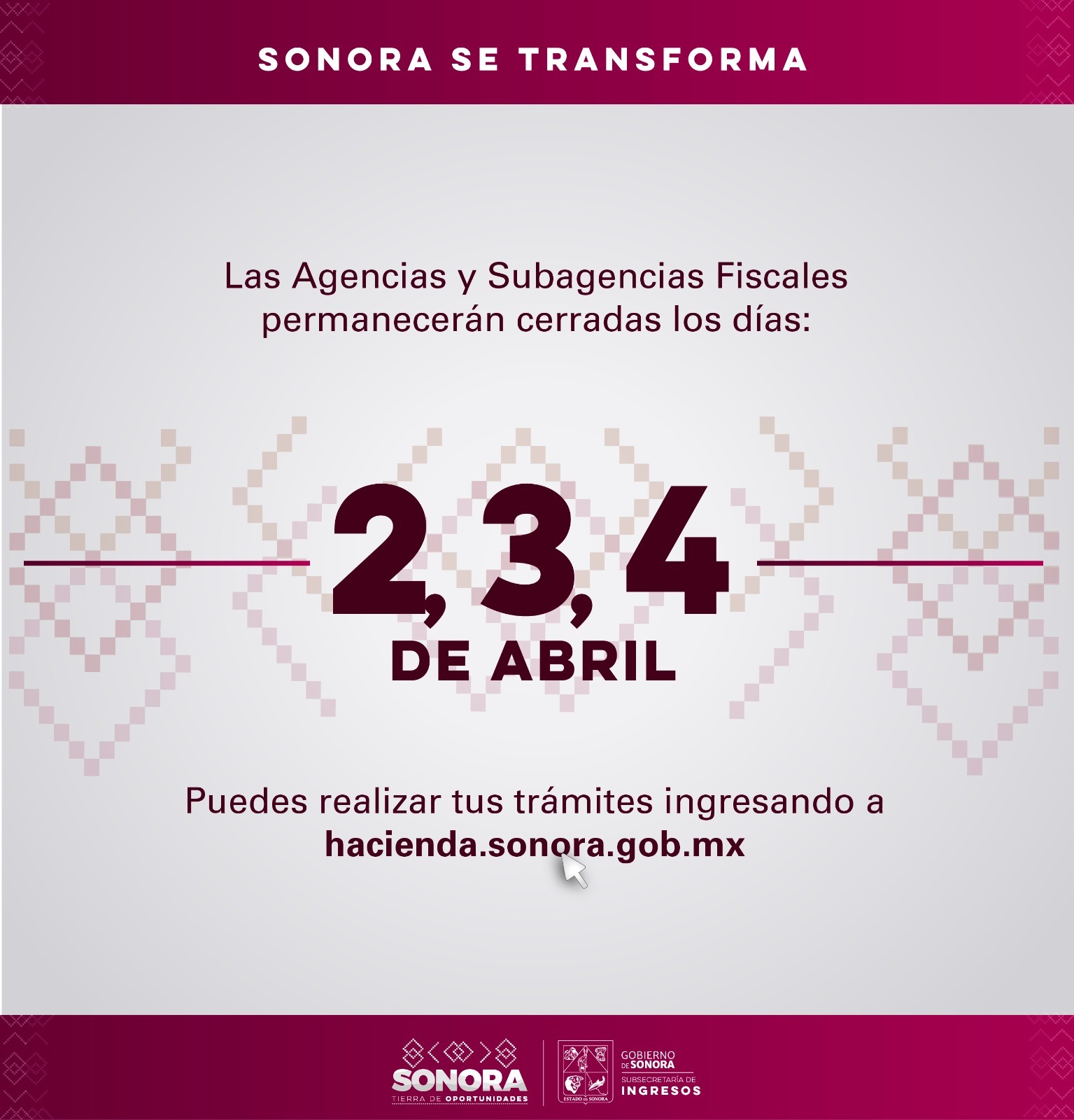 Hermosillo, Sonora; 30 de marzo de 2026.â El Gobierno de Sonora, a travÃs de la DirecciÃn General de RecaudaciÃn de la SecretarÃa de Hacienda, informa a los contribuyentes que las 27 Agencias y Subagencias Fiscales del estado permanecerÃn cerradas los dÃas 2, 3 y 4 de abril durante el periodo de asueto por Semana Santa y se reanudarÃn operaciones en horario normal el lunes 6 de abril.