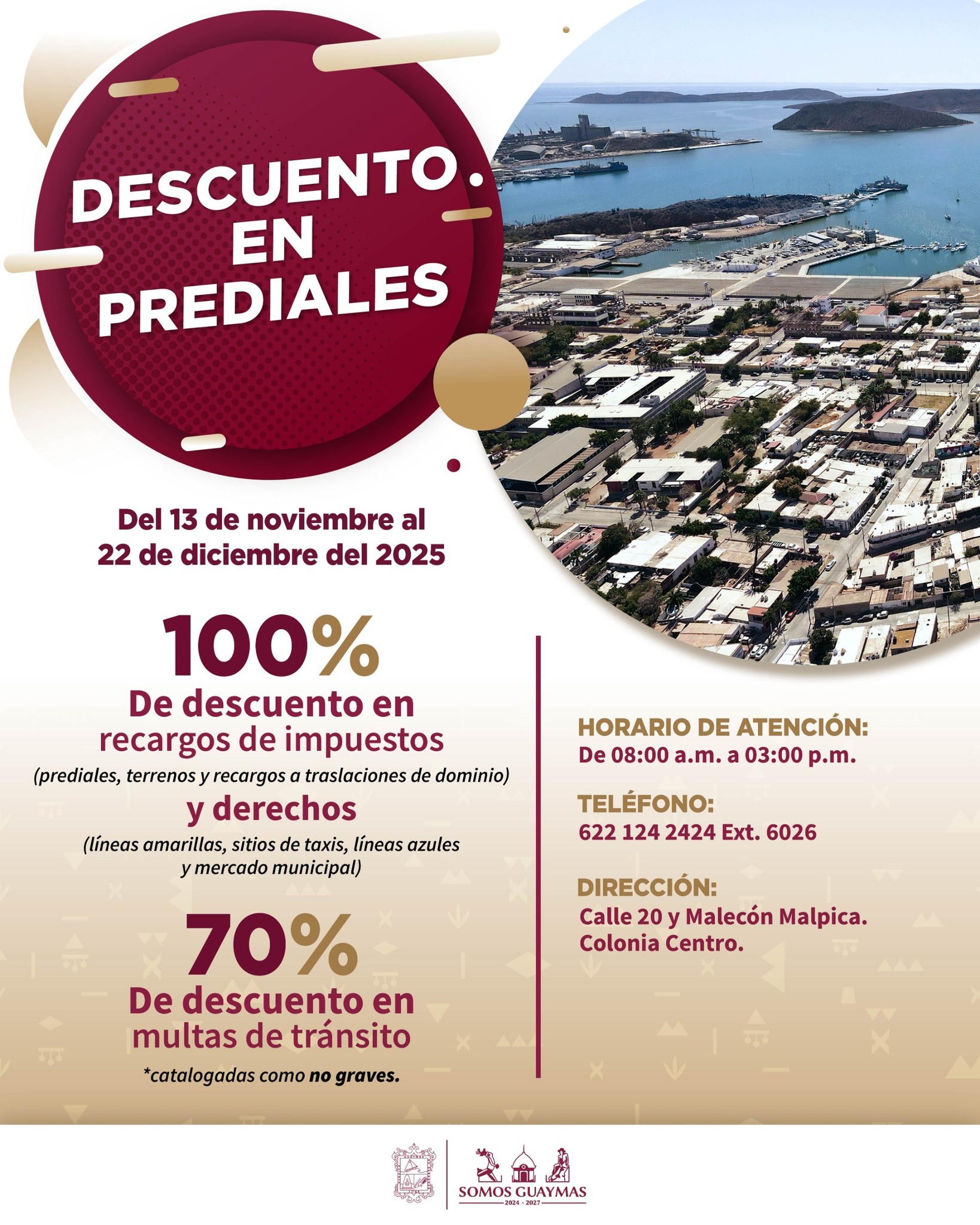 Con el objetivo de apoyar la economÃa familiar y facilitar el cumplimiento fiscal antes de que finalice el aÃo, el Ayuntamiento de Guaymas anuncià la extensiÃn de su programa de estÃmulos fiscales, vigente hasta el prÃximo 22 de diciembre.