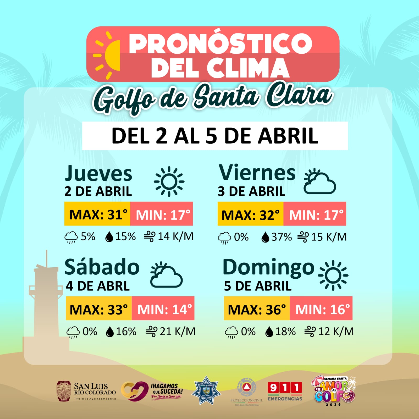 San Luis Río Colorado, Sonora (02 de abril de 2026).- Durante el próximo período vacacional de Semana Santa, se pronostican condiciones de clima cálido y estable en la región, con temperaturas que oscilarán entre los 31 y 36 grados centígrados, lo que permitirá disfrutar de días mayormente soleados.