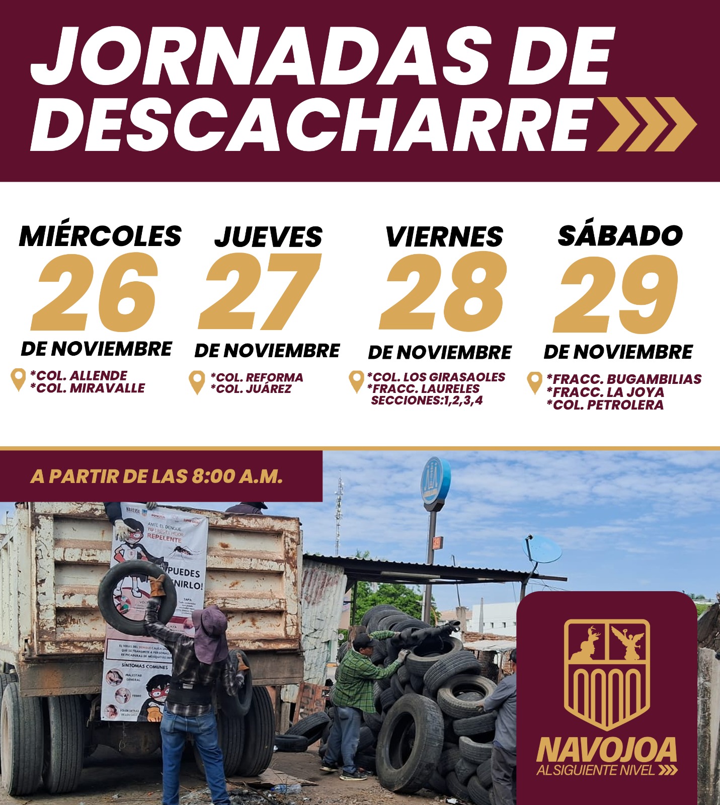 Navojoa, Sonora; 24 de noviembre de 2025.- â Para reforzar las acciones de prevenciÃn del dengue y proteger la salud de las familias navojoenses, el Ayuntamiento de Navojoa informà que esta semana continÃan las Jornadas de Descacharre, recorriendo diversas colonias para eliminar objetos que acumulen agua y puedan convertirse en criaderos del mosquito transmisor del dengue, zika o chikungunya.