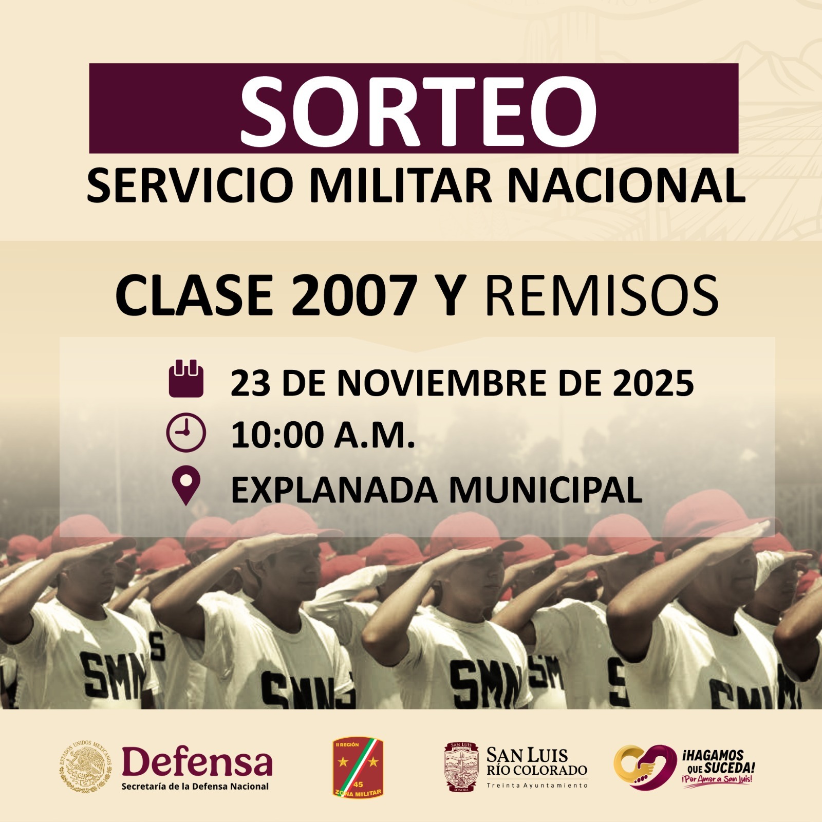 San Luis RÃo Colorado, Sonora; 14 de noviembre de 2025.- Un llamado a participar en el sorteo militar el prÃximo domingo 23 de noviembre, es el que hace la Junta Municipal de Reclutamiento a los jÃvenes de la clase 2007 y remisos.