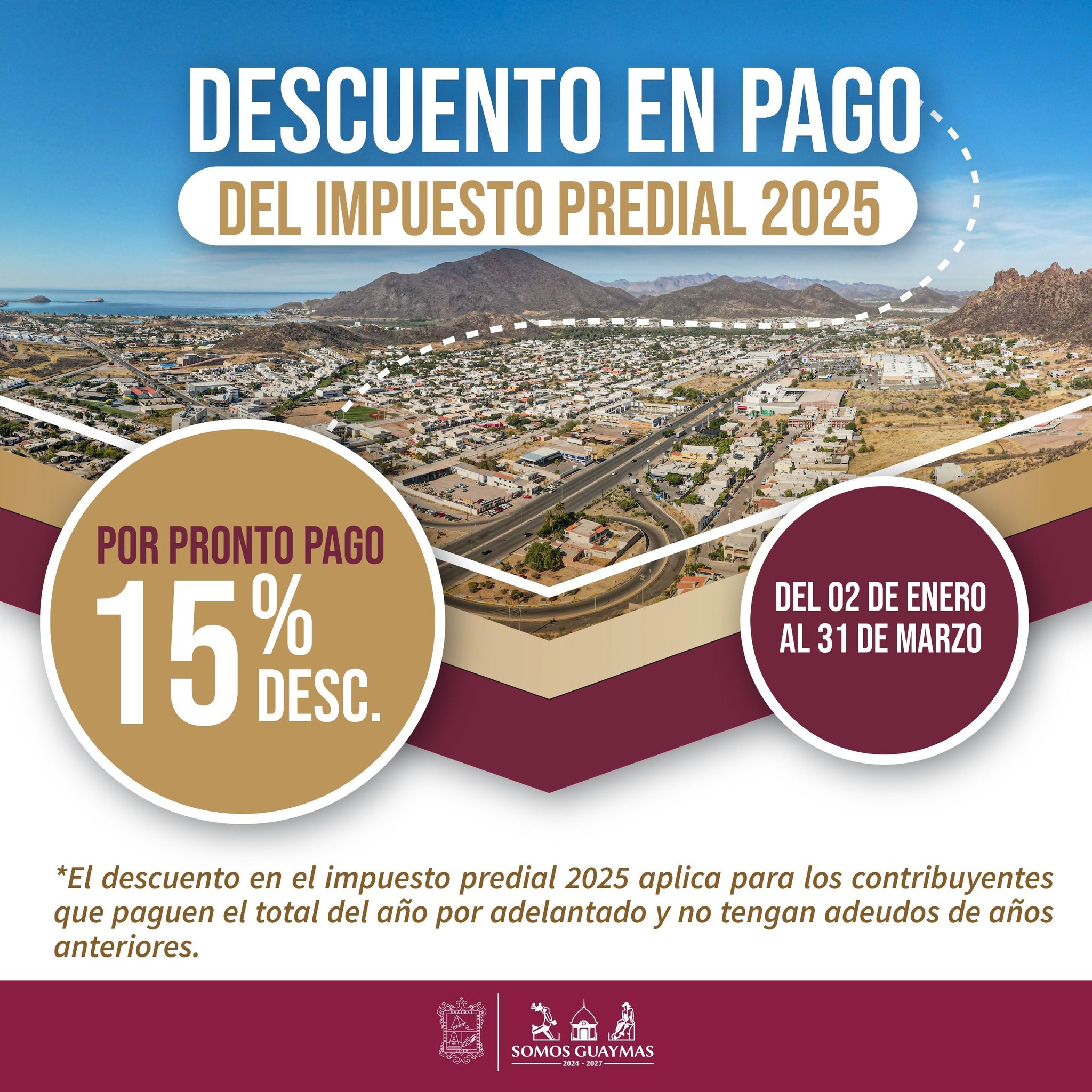 El Ayuntamiento de Guaymas anuncia que, como parte de los esfuerzos para mejorar la ciudad, los contribuyentes podrÃn acceder a un descuento del 15% en el pago del impuesto predial 2025, si pagan el total del aÃo por adelantado y no tienen adeudos pendientes de aÃos anteriores. Esta promociÃn estarà disponible del 2 de enero al 31 de marzo de 2025, informà Daniel Apodaca Larrinaga, Tesorero Municipal.