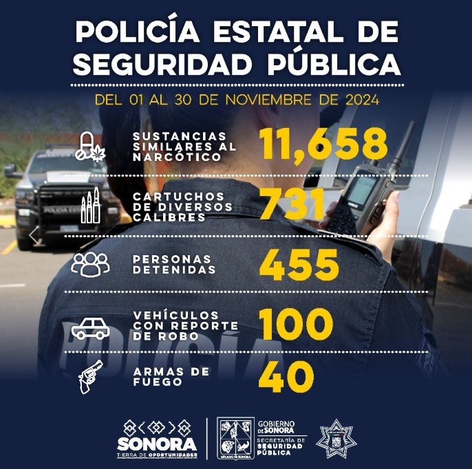 Como resultado del trabajo operativo y de inteligencia que la SecretarÃa de Seguridad PÃblica (SSP) realizà durante noviembre en municipios de Sonora, a travÃs de la PolicÃa Estatal de Seguridad PÃblica (PESP), se logrà asegurar 455 personas, ademÃs de armas y otras sustancias prohibidas.