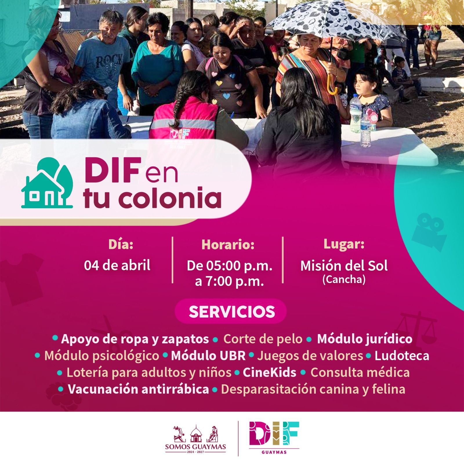 El prÃximo 4 de abril, el programa DIF en tu Colonia estarà presente en la colonia MisiÃn del Sol, ofreciendo una amplia gama de servicios gratuitos para toda la familia. La cita serà de 17:00 a 19:00 horas en la cancha de la colonia.