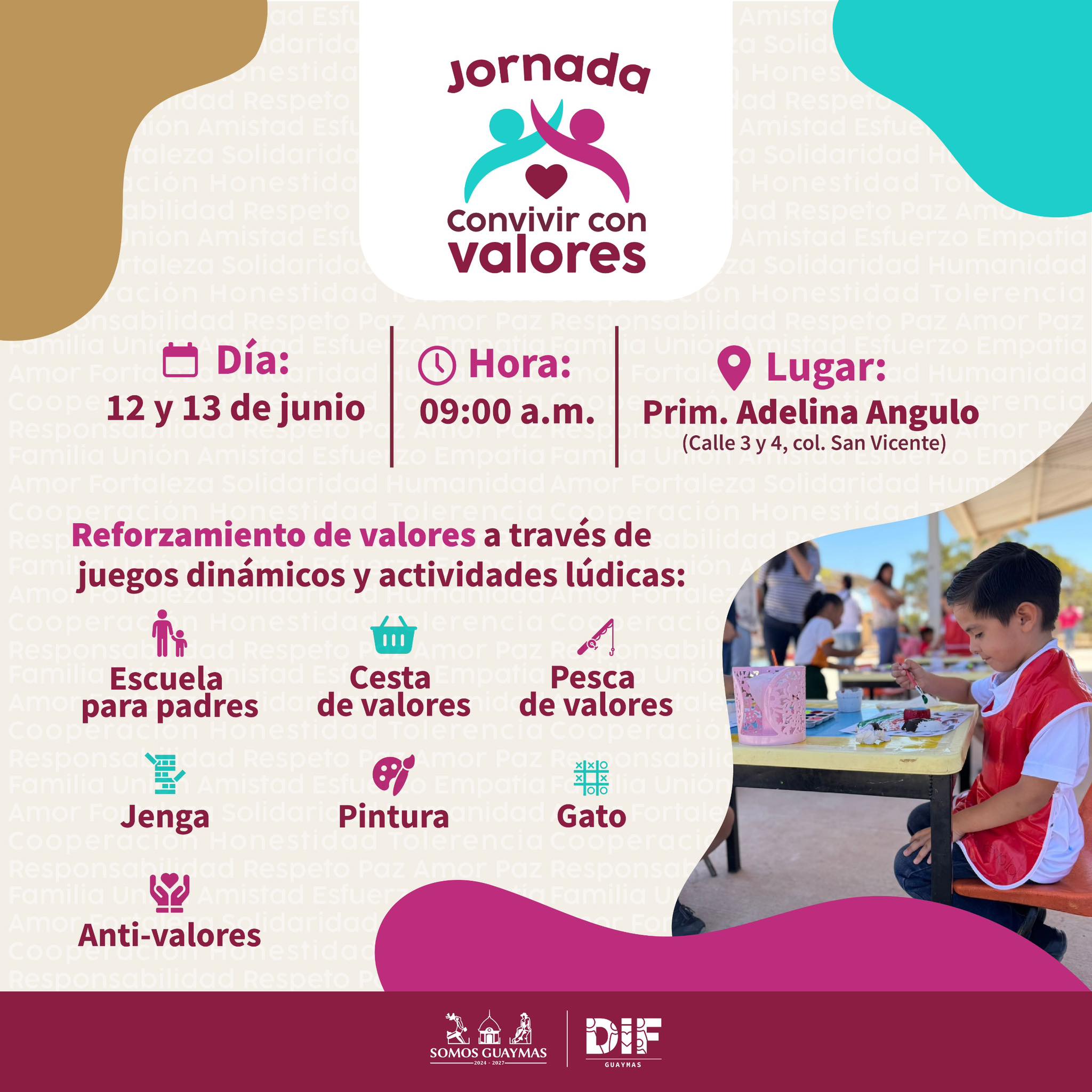 Con el objetivo de fortalecer la convivencia y promover los valores en la niÃez y sus familias, el DIF Guaymas llevarà a cabo la jornada «Convivir con valores» los dÃas 12 y 13 de junio, en la Escuela Primaria Adelina Angulo, ubicada entre las calles 3 y 4 de la colonia San Vicente.