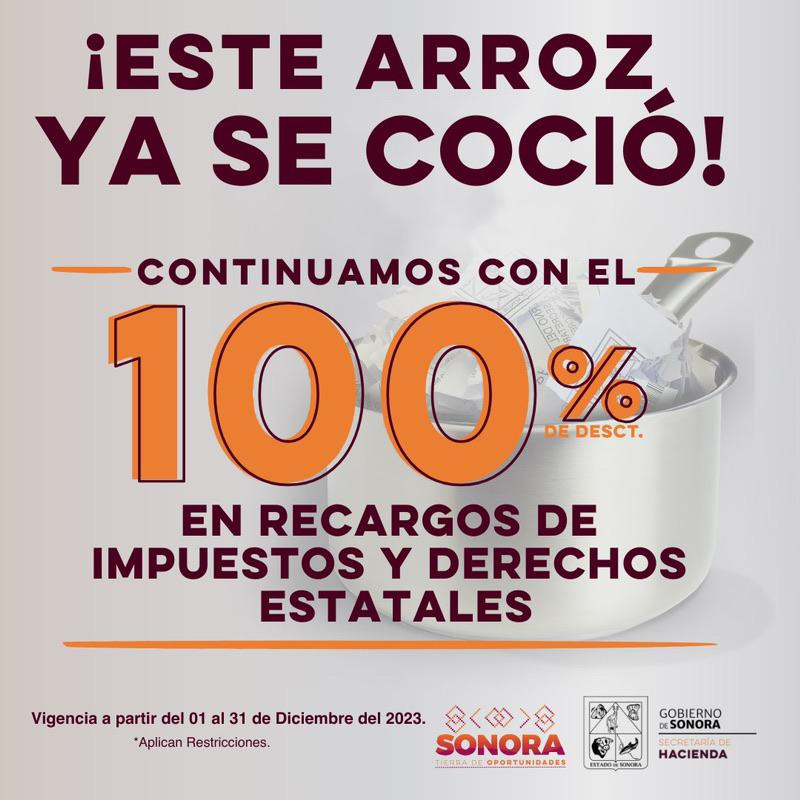 Hermosillo, Sonora, 01 de diciembre 2023.- El Gobierno de Sonora, a travÃs de la SecretarÃa de Hacienda, reafirma su compromiso de respaldar la economÃa familiar ofreciendo descuentos de recargos en impuestos y derechos estatales durante todo diciembre. Esta iniciativa tiene como objetivo primordial brindar a las y los contribuyentes la oportunidad de regularizarse en sus obligaciones y pagos fiscales pendientes.