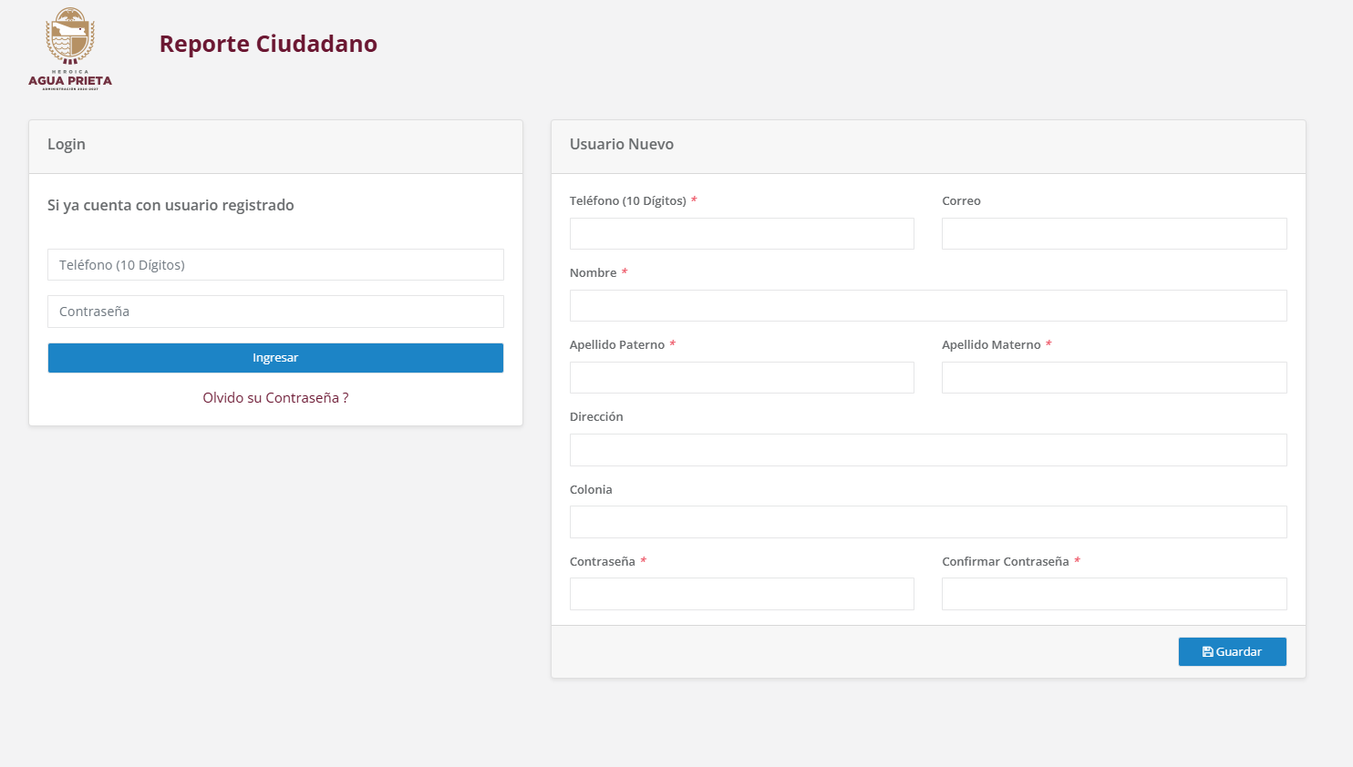 Esta herramienta digital se creà para que las y los ciudadanos puedan realizar reportes de manera mÃs Ãgil y directa, por lo que basta con ingresar al sitio oficial del H. Ayuntamiento de Agua Prieta https://aguaprieta.gob.mx y dar clic en el apartado âAtenciÃn Ciudadanaâ, en donde se deberà llenar un formulario con datos personales para accesos posteriores, donde se podrà consultar el proceso de sus reportes.