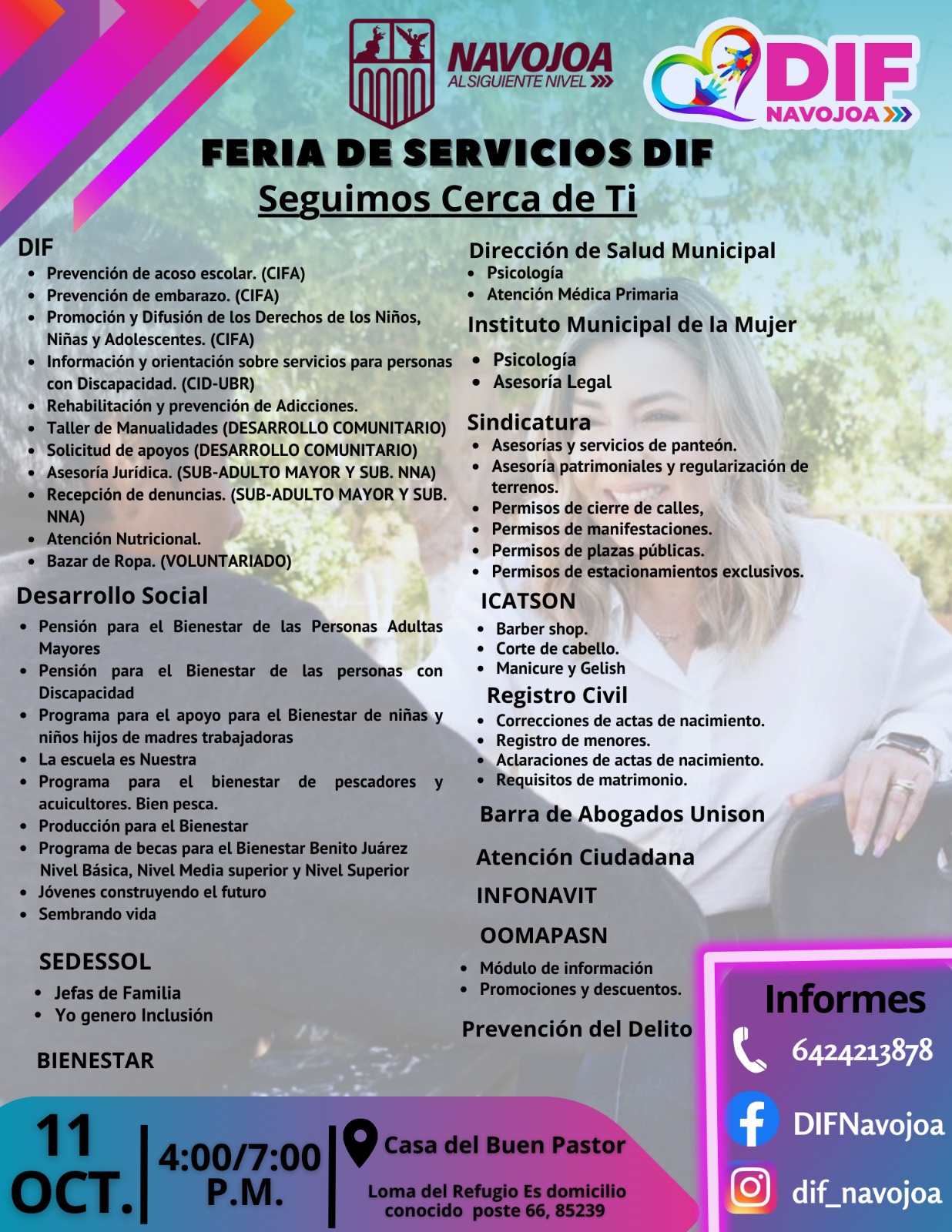El DIF Navojoa llevarà a cabo este viernes 11 de octubre, a partir de las 4:00 de la tarde, la Feria de Servicios «Seguimos cerca de ti», que tendrà lugar en la Casa del Buen Pastor, ubicada en la comunidad de Loma del Refugio.